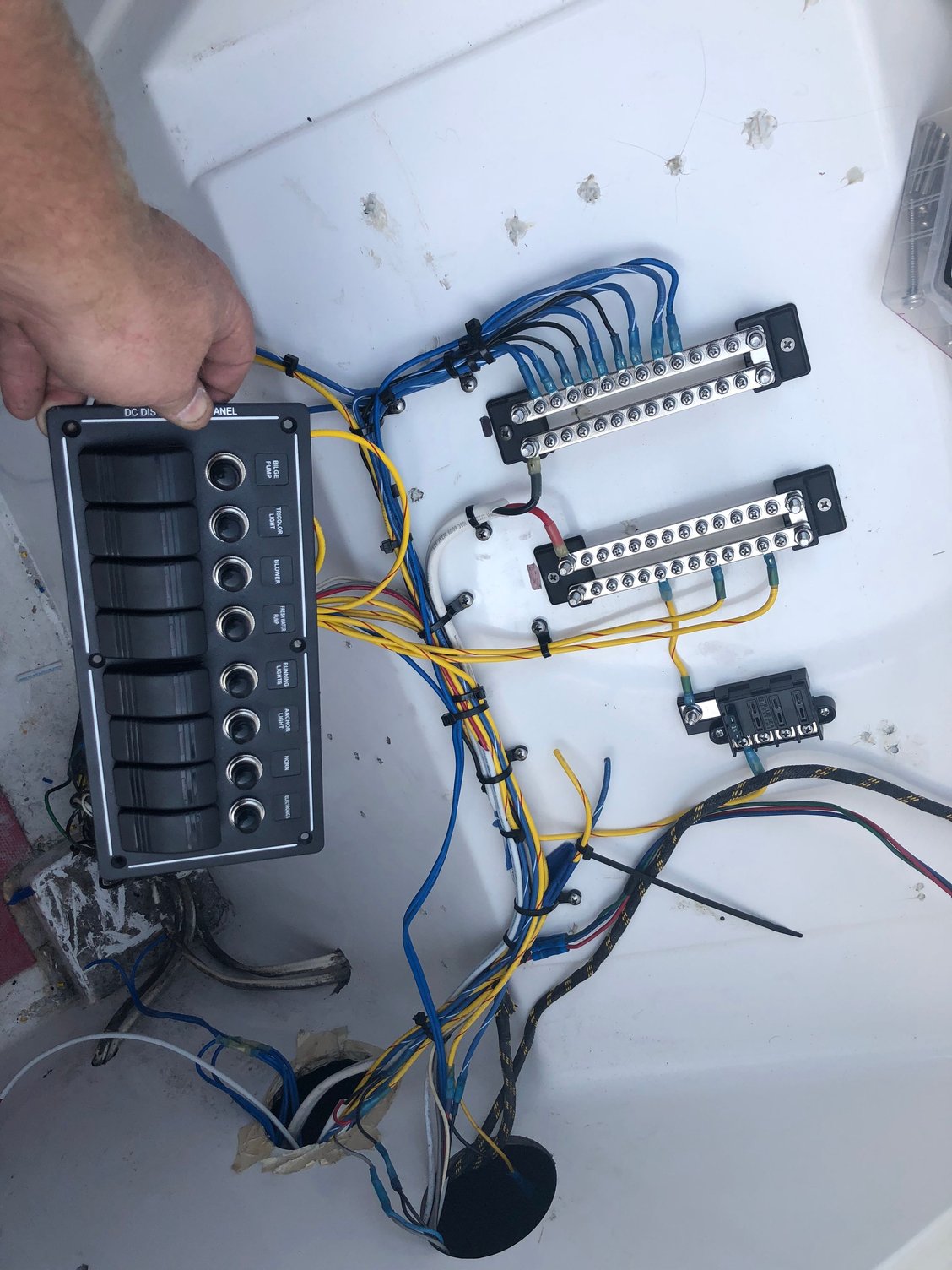 the wiring is pretty much 95 percent done. Went faster then I thought. Everything is working again and the boat has probably half the wire it used to have. Will be going back with 3 batteries.