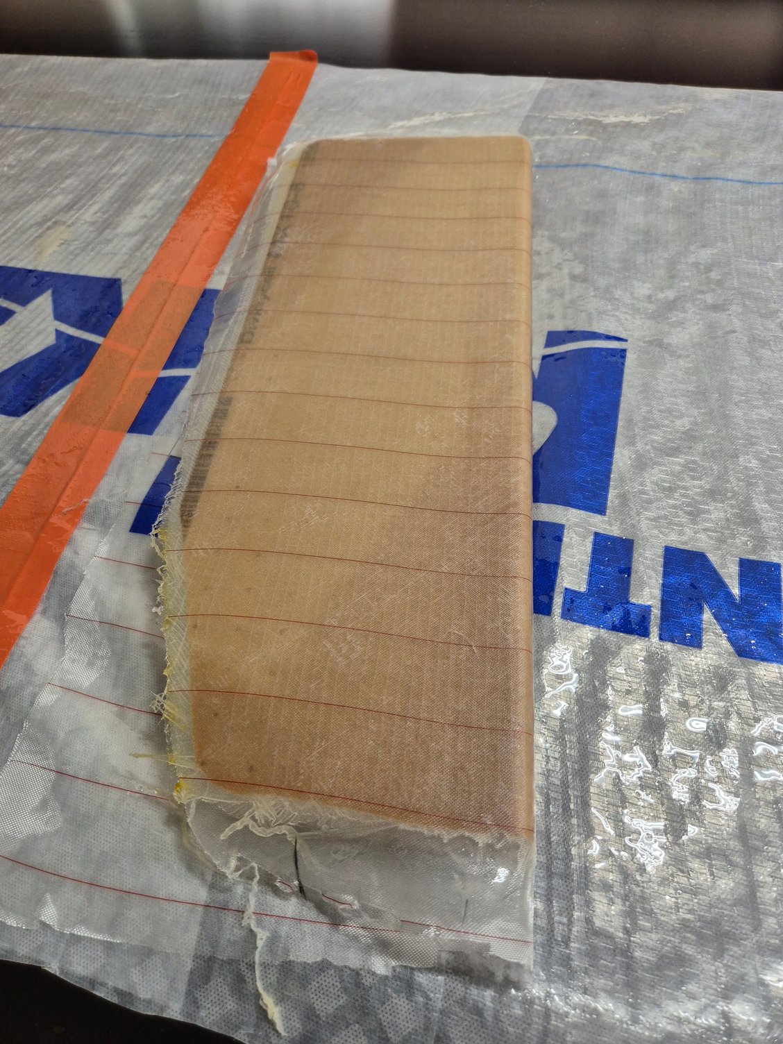 Last night I infused new test part, looks like it could be now succeed. I used Saerfow internal flow media, it transport epoxy 1150mm distance under 7mm thick carbon triaxial laminate and test piece looks soaked well!