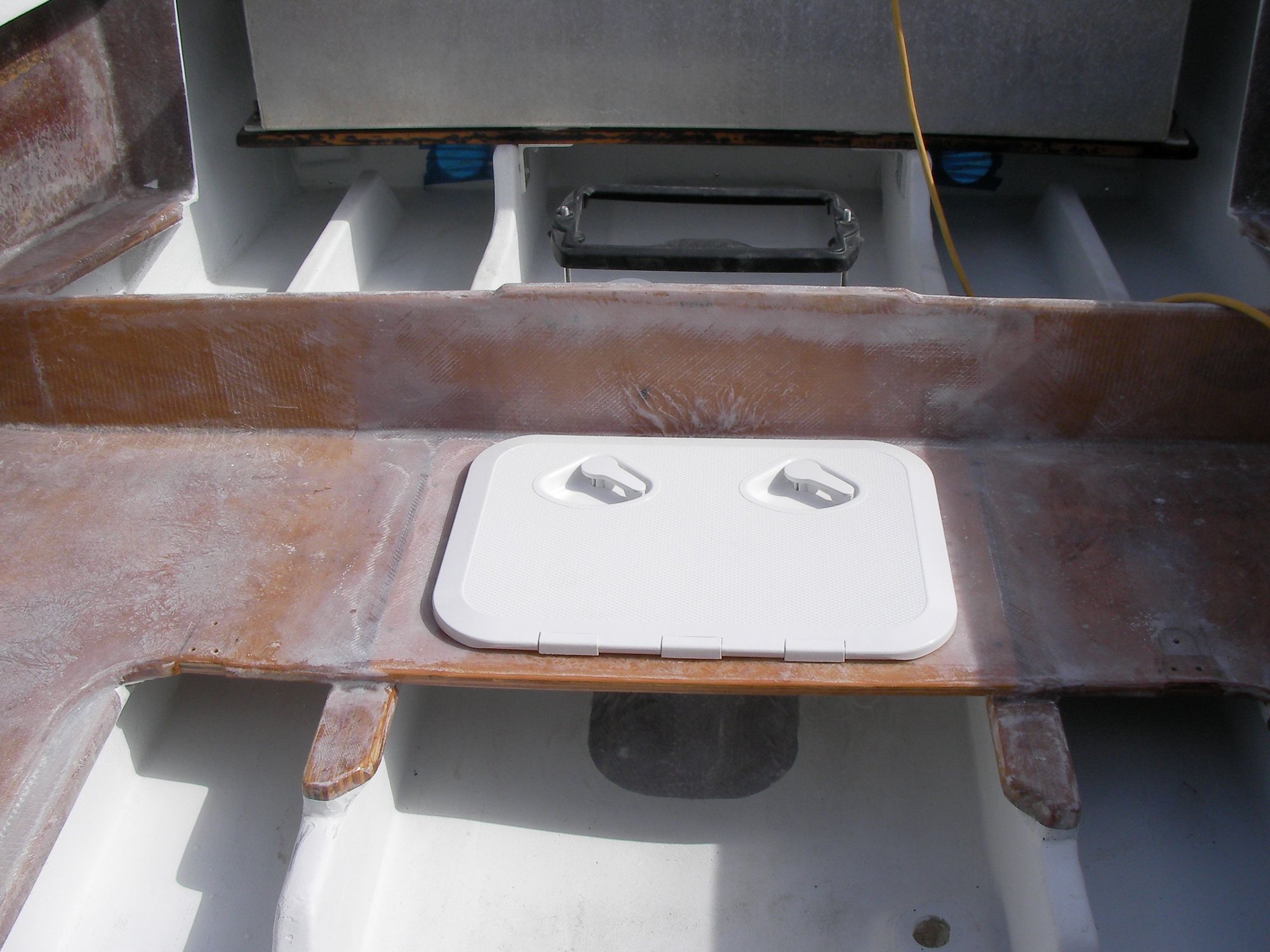 Front and rear hatches got ground down underneath, bedded down on glass, doweled and glassed over. It'll look better this way, and she needs all the fit finish help it can get
