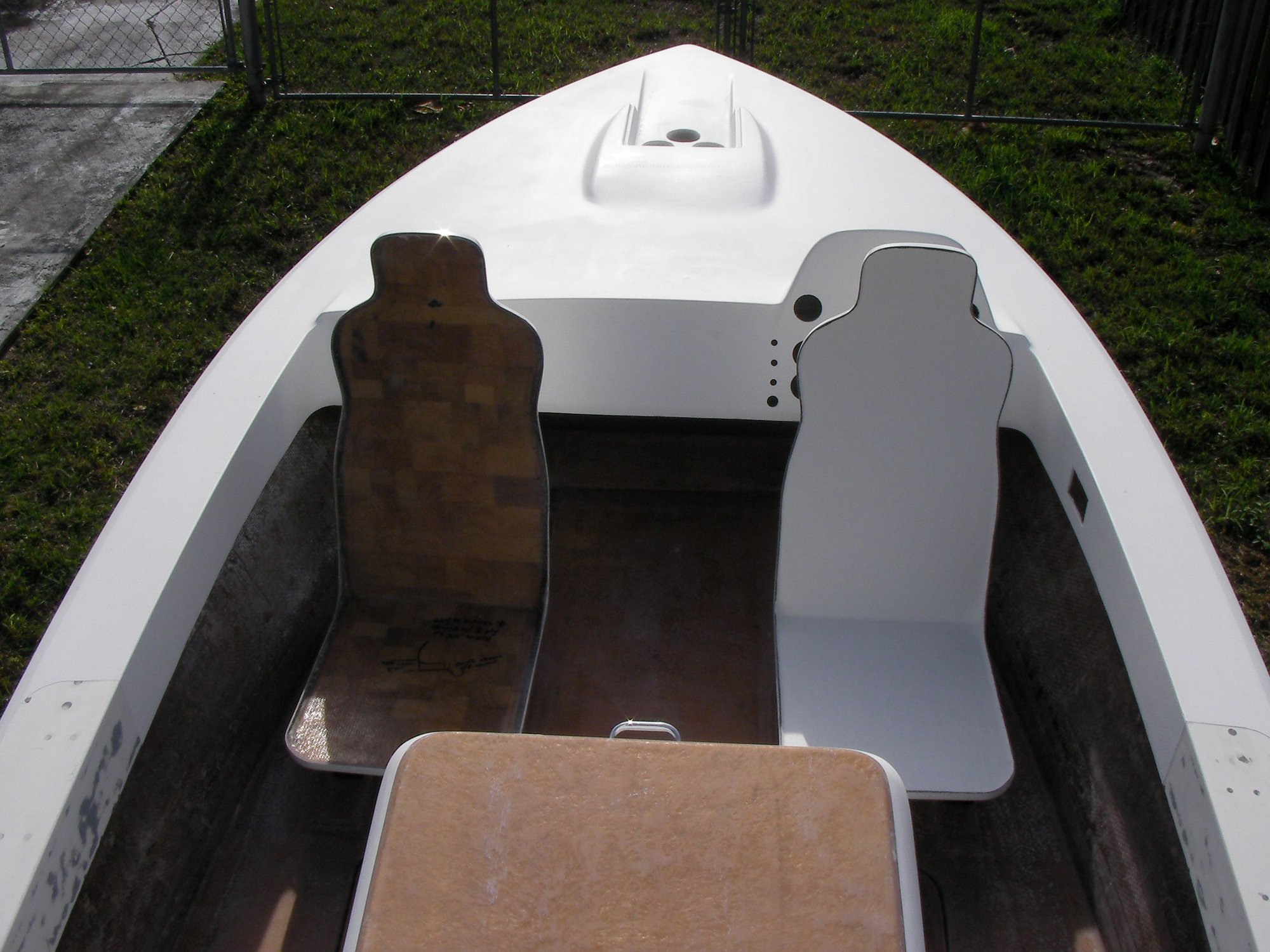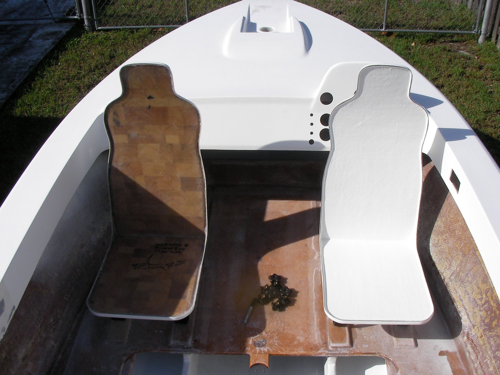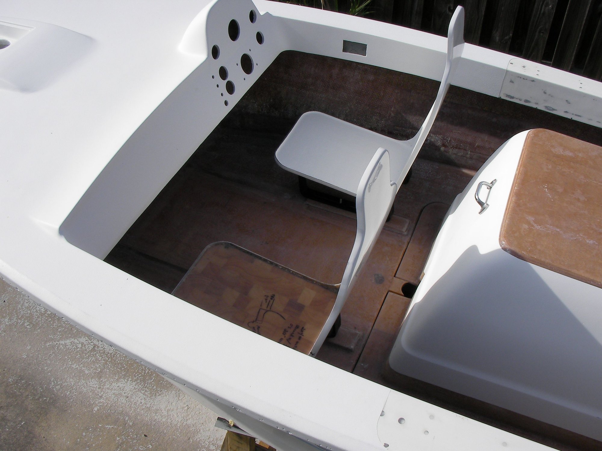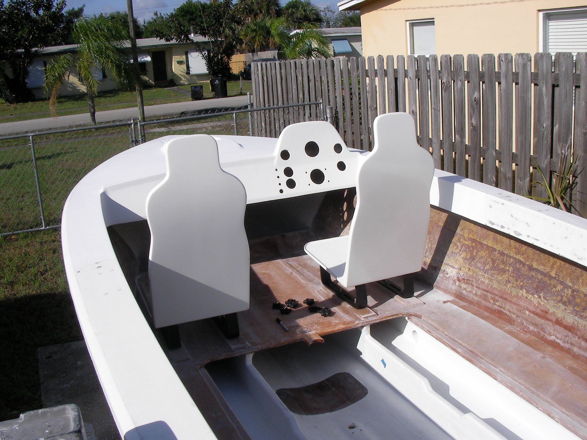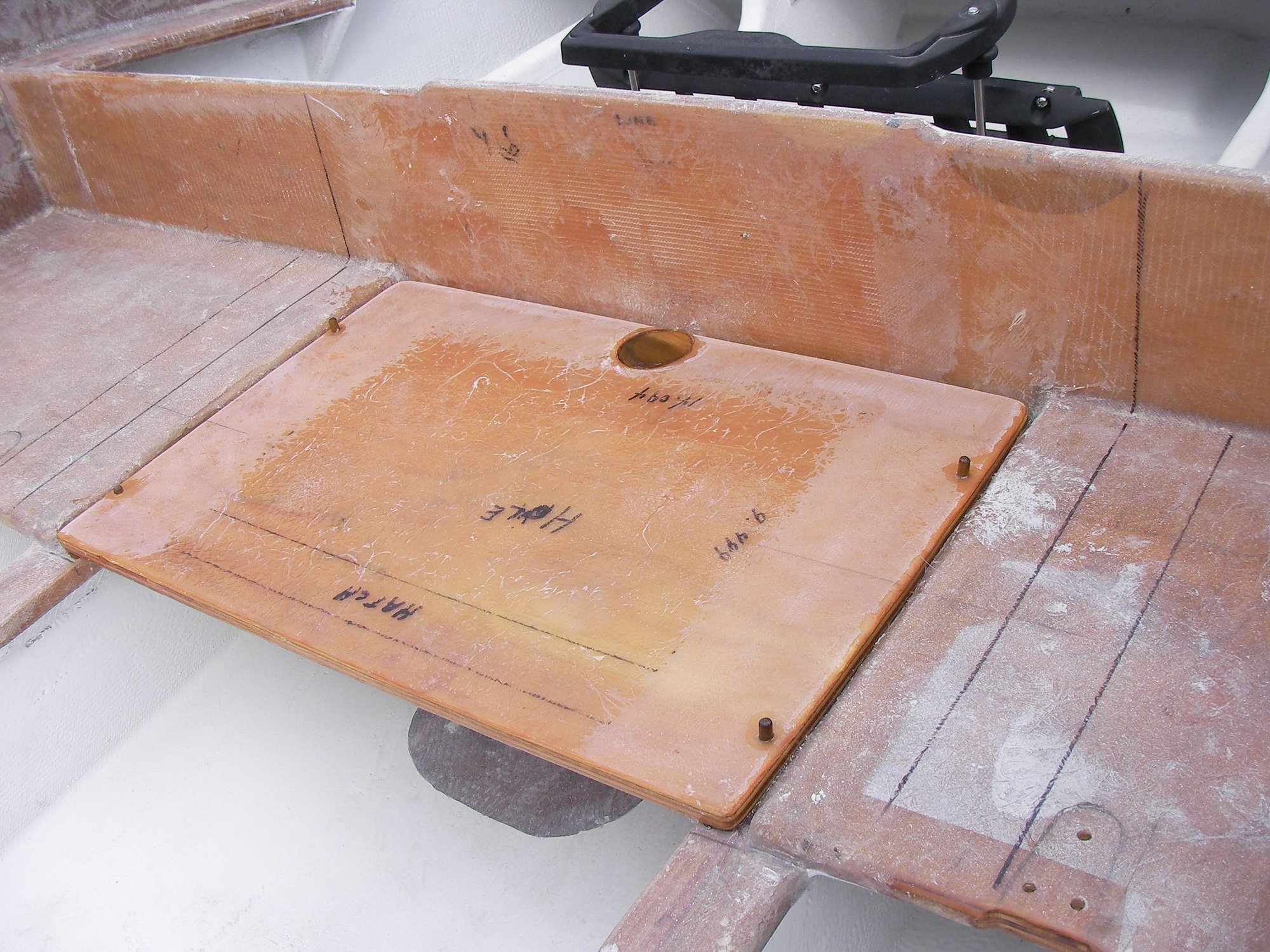 Final grind on interior hullsides and floor. Initial knockdown dog box and back seat gelcoat.