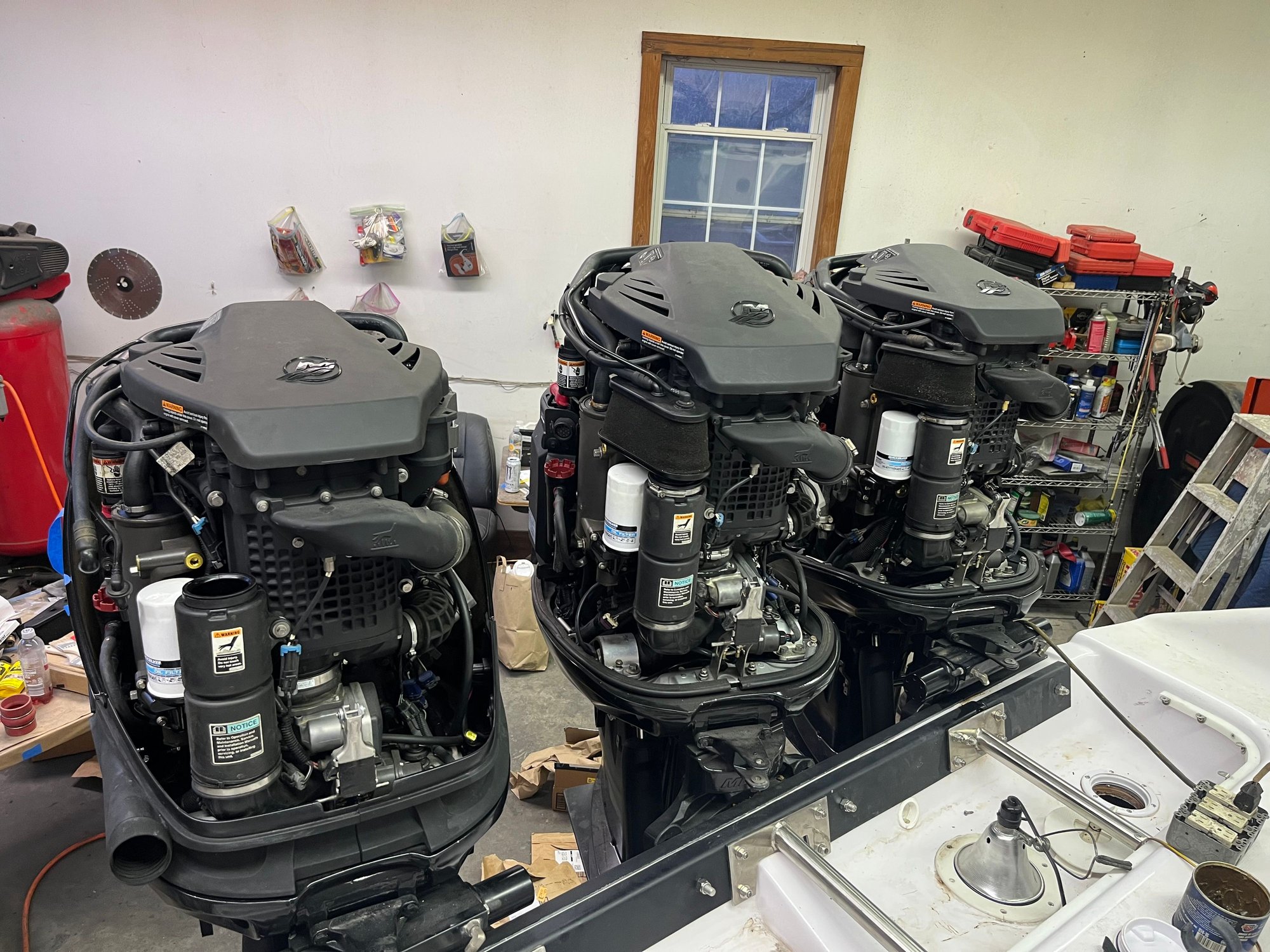 The motors are 2011 300 Vrods completely rebuilt, .020 over Wiseco forged pistons flashed 345 hp. Original 275’s were 25” shafts. Trips have 20” P/S 30” center. I’ve had the trip 300’s for about three years waiting for a hull. Nothing wrong with