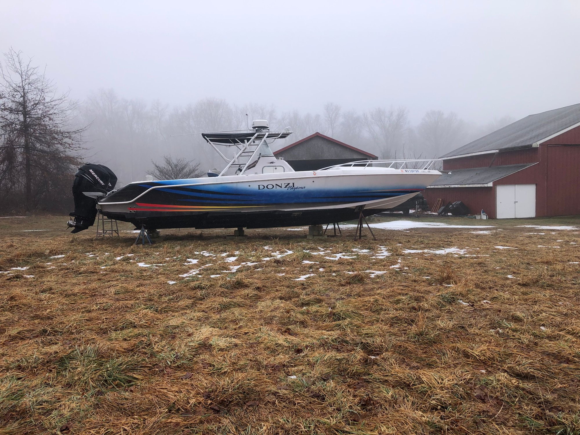 Here are some pictures and info on the progress of my Donzi/CoPart special. The boat was purchased at auction, it was a water/flood boat out of RI. First thing was to media blast the AF paint off the bottom followed by my plan to convert to triples. Boat came with twin 275 Verados which I managed to turn over by hand on the flywheel. So not frozen, filled cylinders with penetrating oil for some future rebuild.