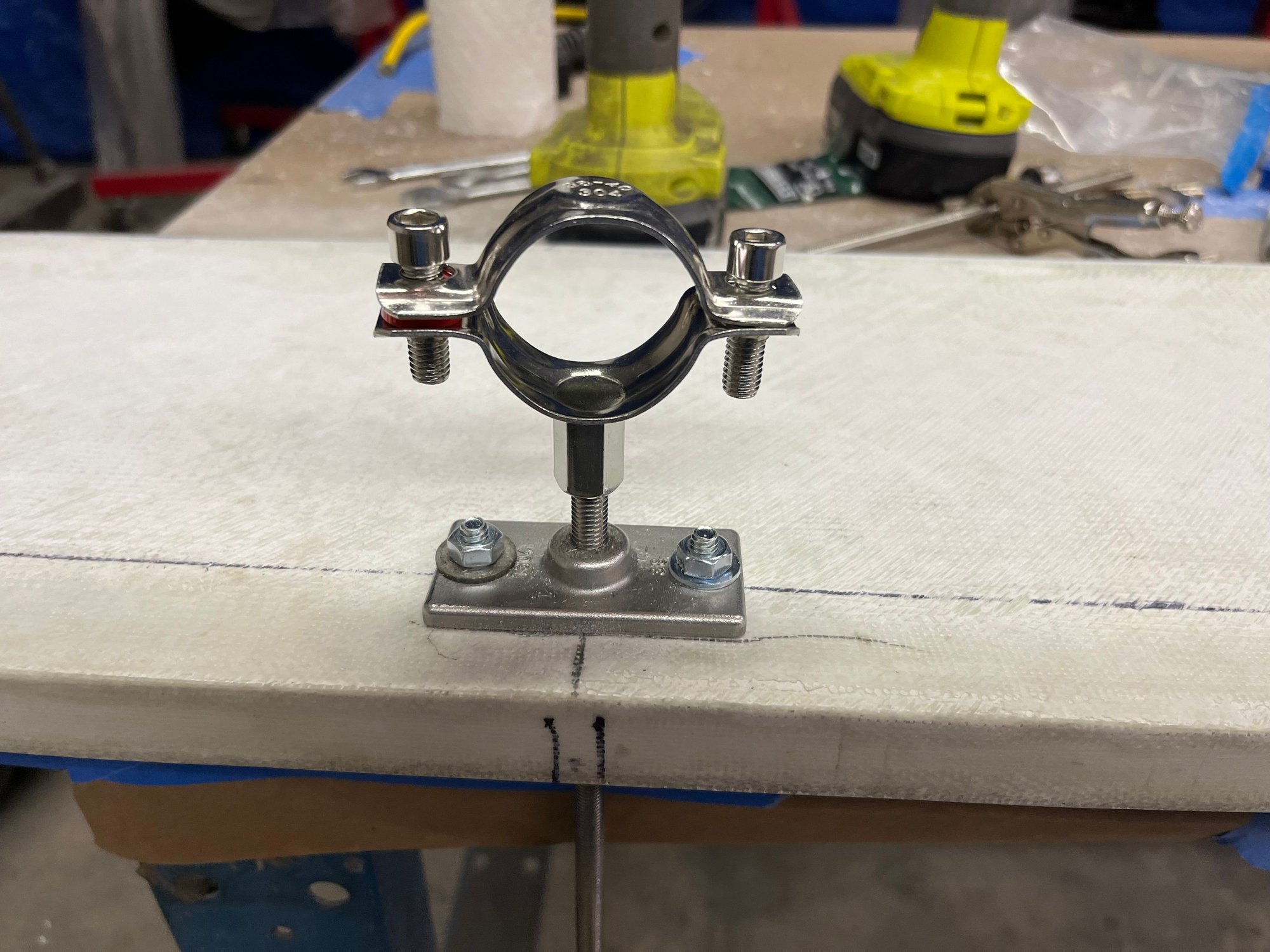 Found some metric SS pipe hangars that sit on the tubes to support the aft splash well panel. The forward panel and sides sit on a 3/4 x 1-0 inch thermoformed piece of PE.