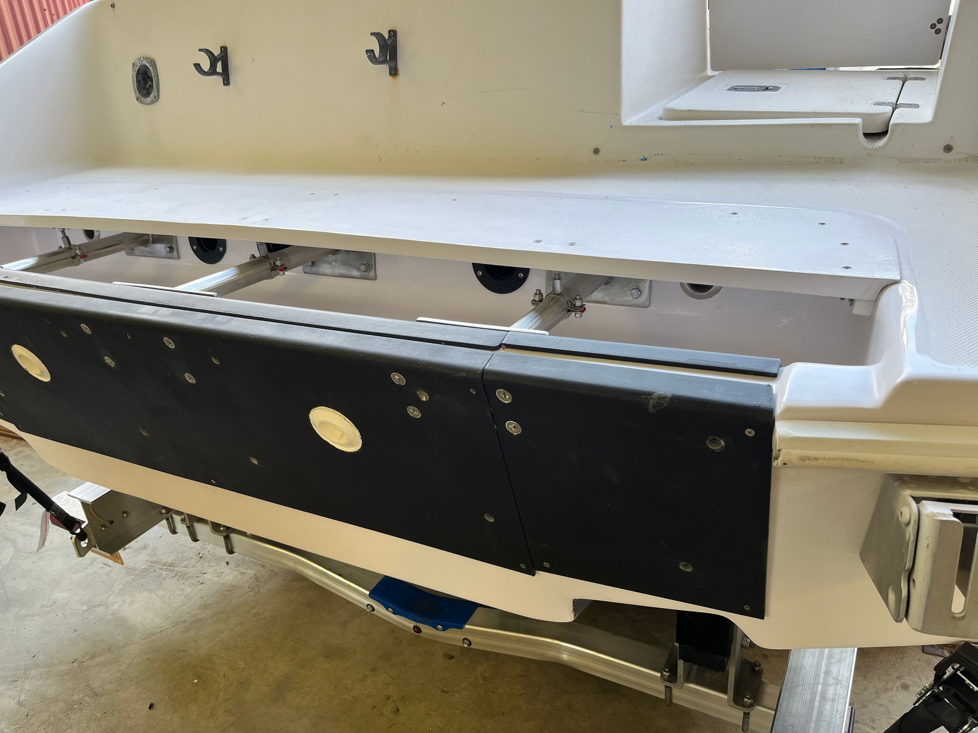 scuppers were moved and additional aluminum transom plates installed. At this time I made a panel to increase the width of the ledge forward of the splash well from 9” to 18-1/2” to provide a position to fish over the motors. Not my idea, the person who owned “Fantasea” added it on a motor retrofit.