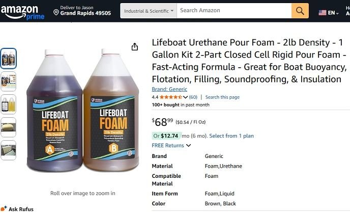 Rookie Thats the same foam I used when I did the 70 gallon tank in my Sea Ray. I ended up using twice as much as I thought. I used two of the 1 gallon 4lb density kits and one of the one gallon 2 lb density kits. I had about 1/2 gallon left over. I poured it into red solo cups, timed the mixture and poured it really fast. the mixing time is about 20 seconds. I also spaced the tank off the bottom of the hull about 3/4 of a inch and poured the foam around the sides so it would run down to the bottom and support the bottom of the tank.