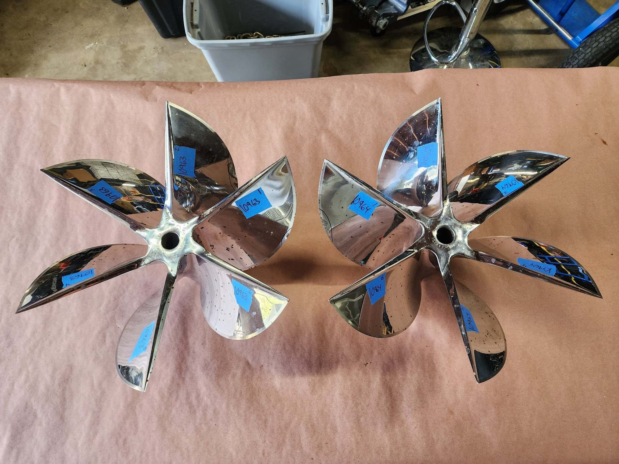Thanks guys, I purchased some used 6 blade herring 17.25 diameter x 27 pitch x 16 rake, they are on the boat now, plan to run it tomorrow. I straightened about 3 minor bent edges and 1 decent sized one. They’re good enough to run. If they work out I’ll have them repaired. We’ll see.