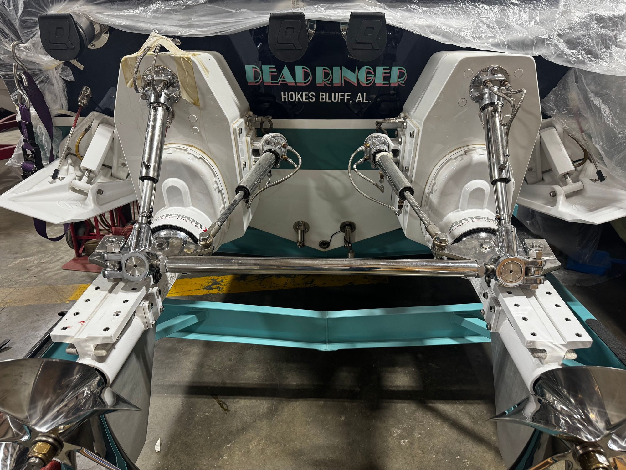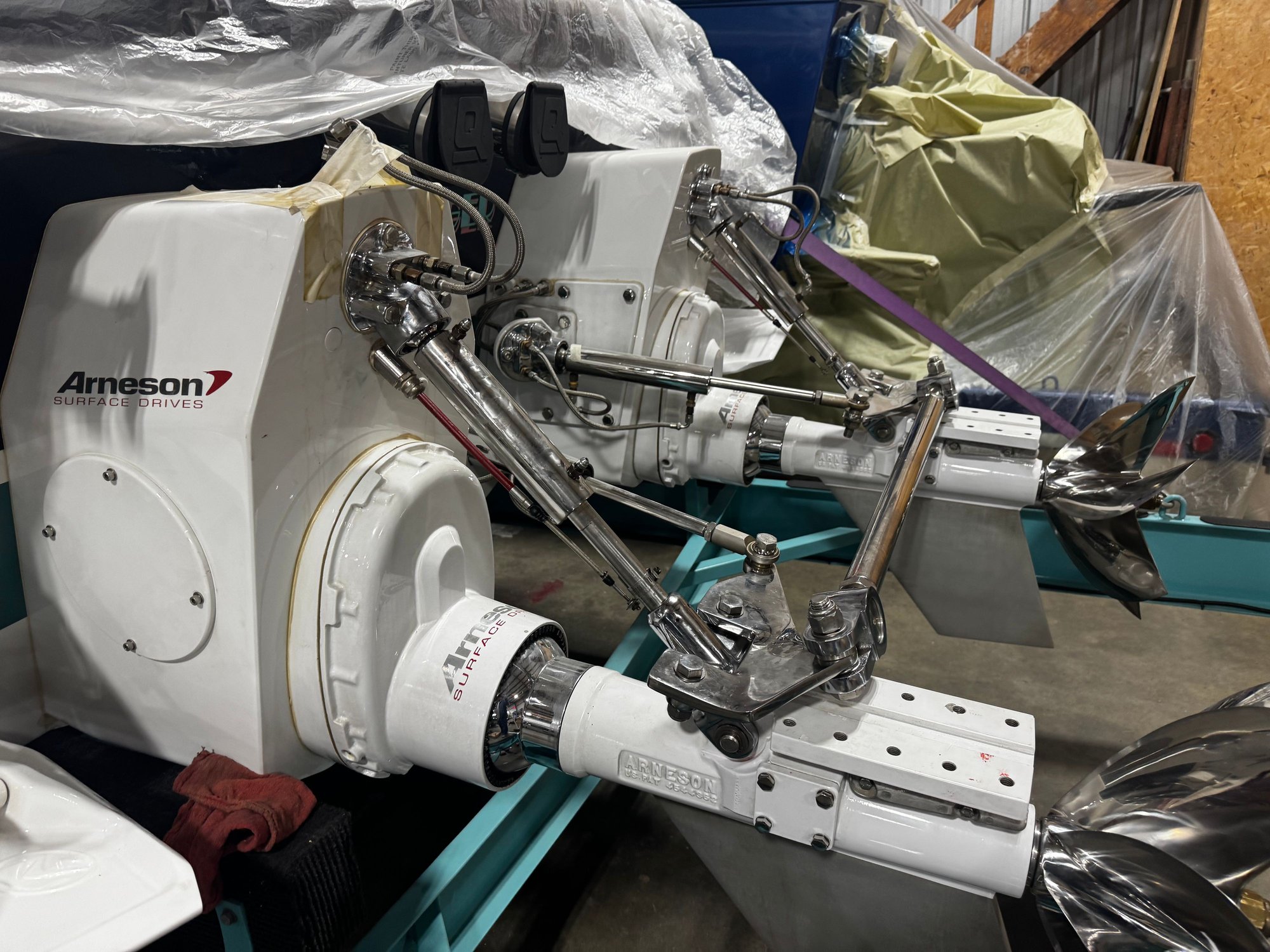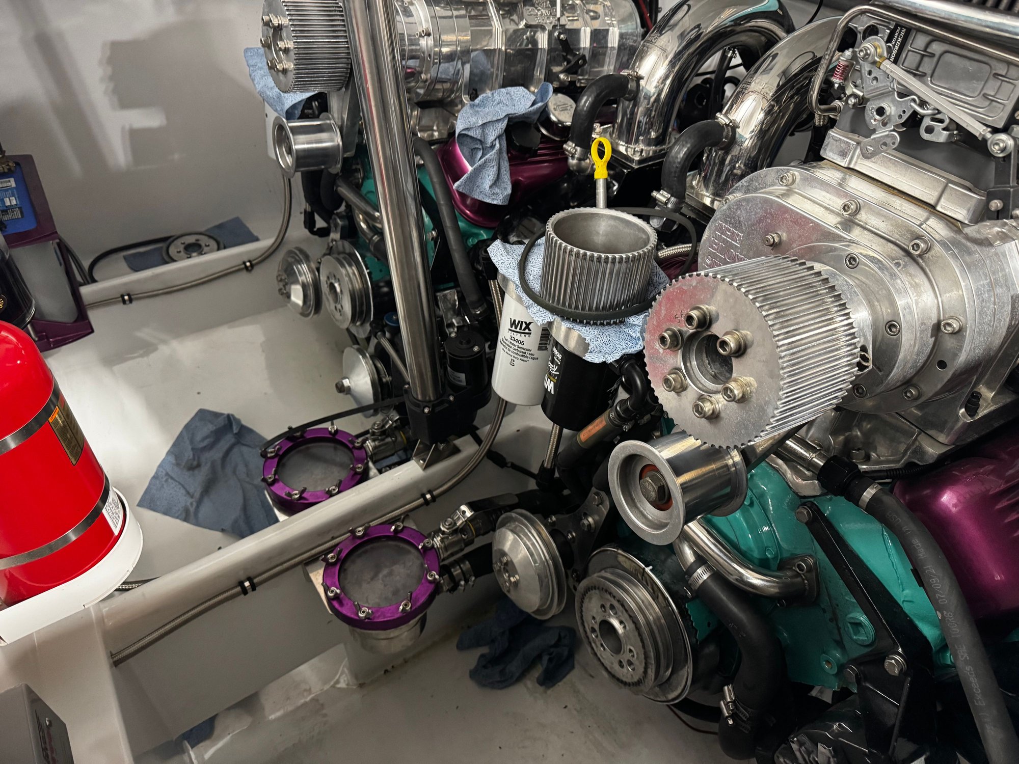 Instead of replacing it I picked up a spool of stainless wire and I’m just gonna weld it up. Rik would send me another one but I’ll just have a shiny weld the size of a pencil eraser on the back of the port trim cylinder no big deal. Y’all don’t tell anybody lol, I’m close to being done changing the drive oil. (2 different cavities in each drive) Also gonna change the engine oil and blower gear oil. I ordered another case of engine oil today. Also finally getting around to replacing the port alternator belt, which has been a lawnmower belt this whole time 😆 That’s the only really ghetto thing I’ve done. Also got some black harmonic balancer covers to replace the chrome ones, chrome ones very hard to set timing on. I got Daniel under the trailer Thursday to go over and tighten all nuts and bolts just because. Also Rik is getting me some fresh hydraulic fittings for the drives. The ones I’m running got stained up from the time in Miami in 2024. Literally the only thing that showed any signs of salt. Happy to get all this maintenance stuff done and looking forward to a good boating season.