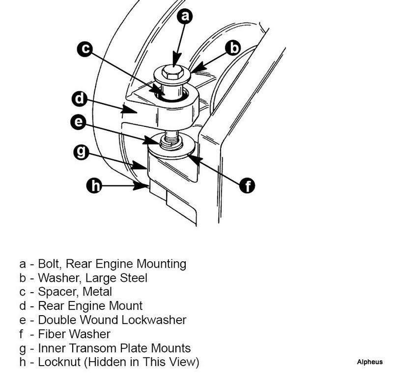 You can also use a single layer of masking tape on the large fiber washer and lock washer thing (looks like a really short spring) to hold them in place on the transom plate. After lowering eng down on rear mounts, push the bolts thru the masking tape.