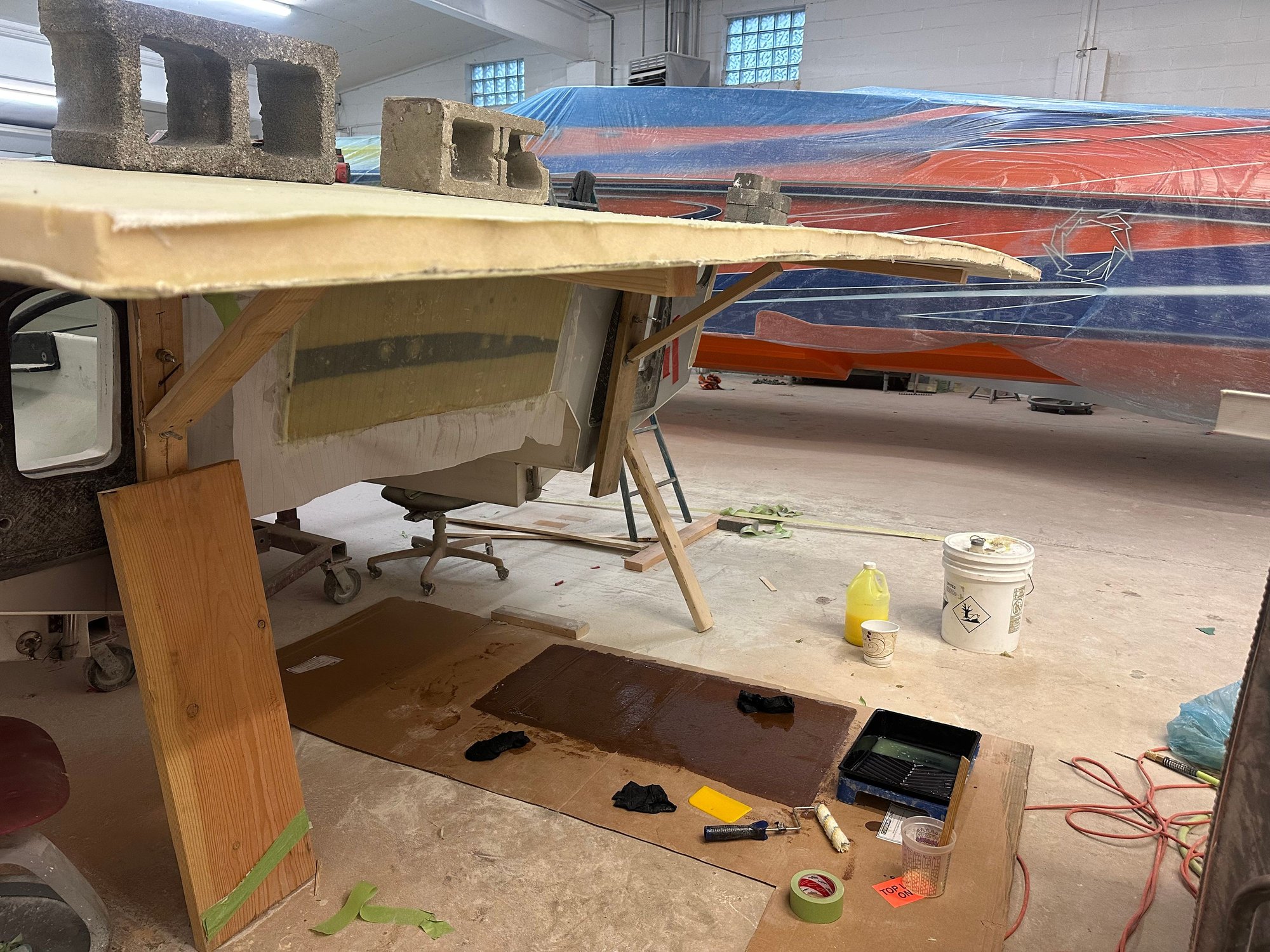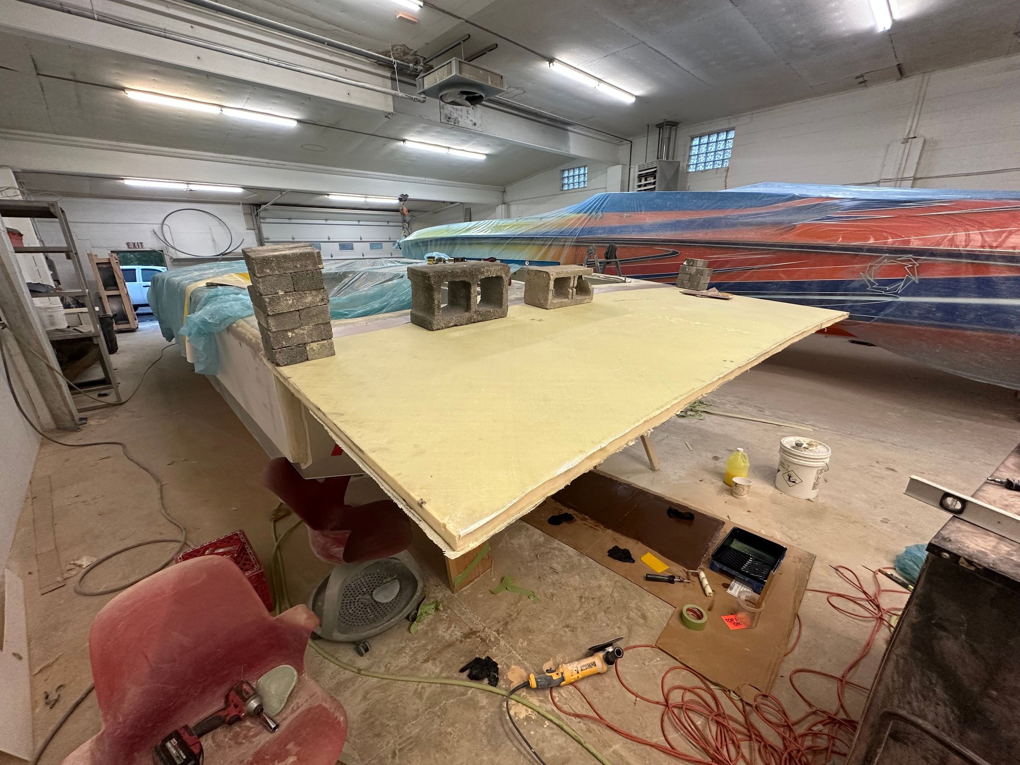 Bustle blank built. Gruit a500 1.5” foam. Vacc’d down epoxy. Then we draped and weighted the panel with the resin still green over the boat to match and post cure the laminate to the contour of the deck to make fitting easier. Contour’s the core to match the roll of the deck to make seam as small as possible. Epoxy compound to fill the gap. Going to lock it down and rough in the sides before cutting the shape.