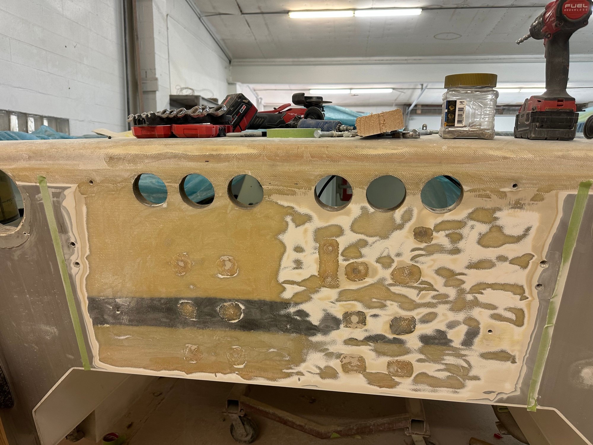 center of transom was all swollen from old holes that were deleted so we blew that out. Capping those up with 2 layers of 1700 to hold the swelling down.