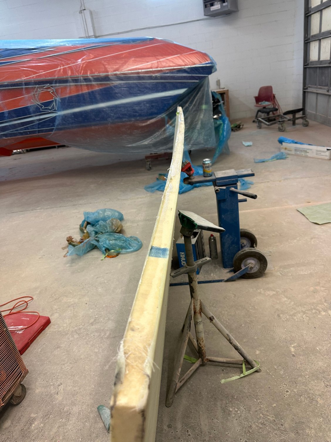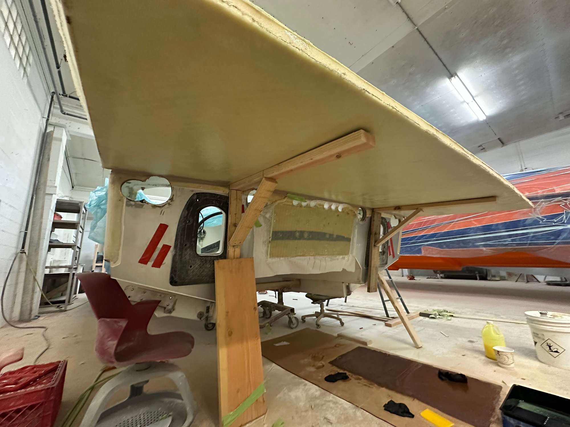 Moved up to the front shop and off the trailer. Deck is post cured and peel ply removed. Now there’s no question on bonding abilities with the next layers of product.