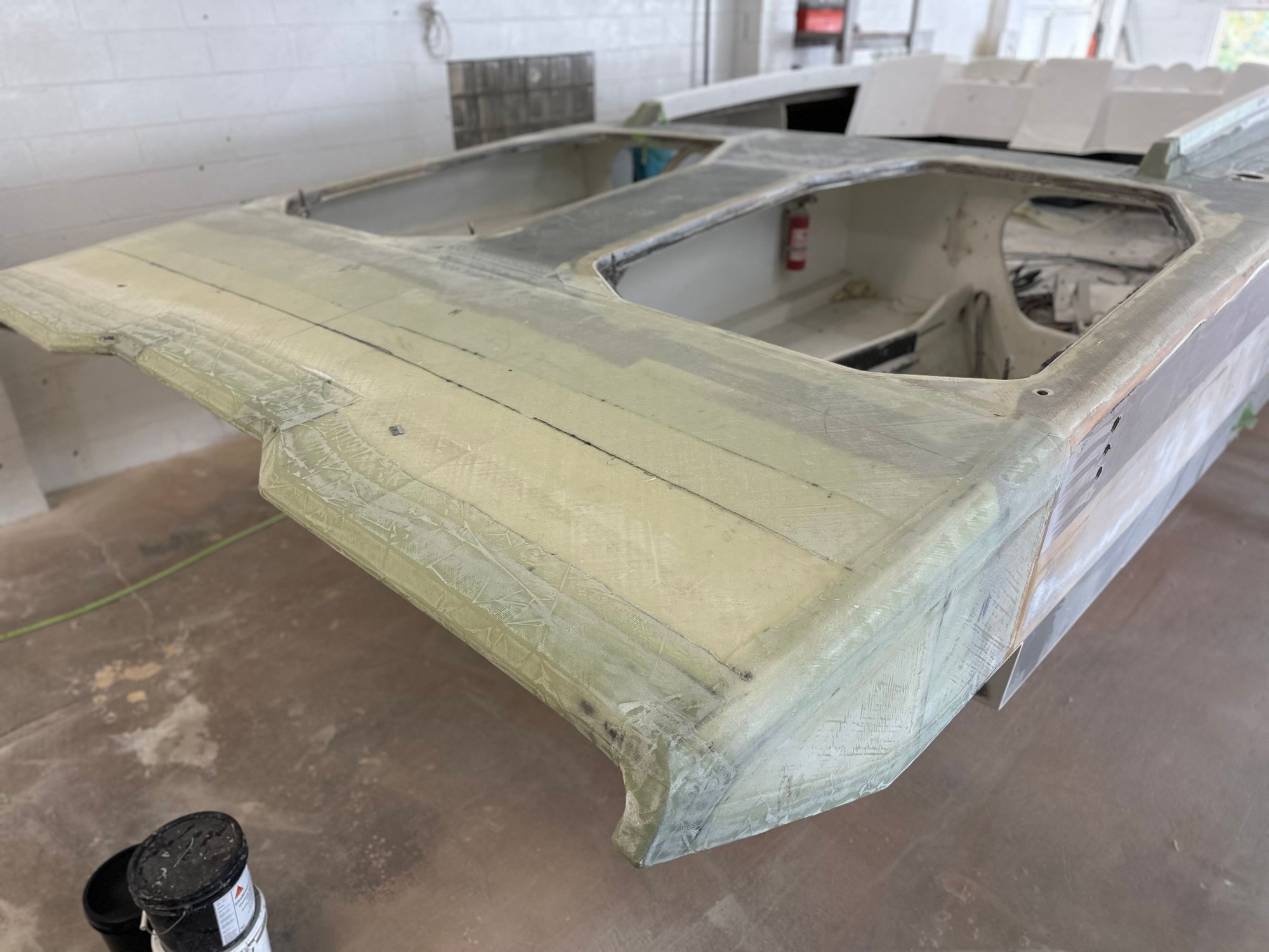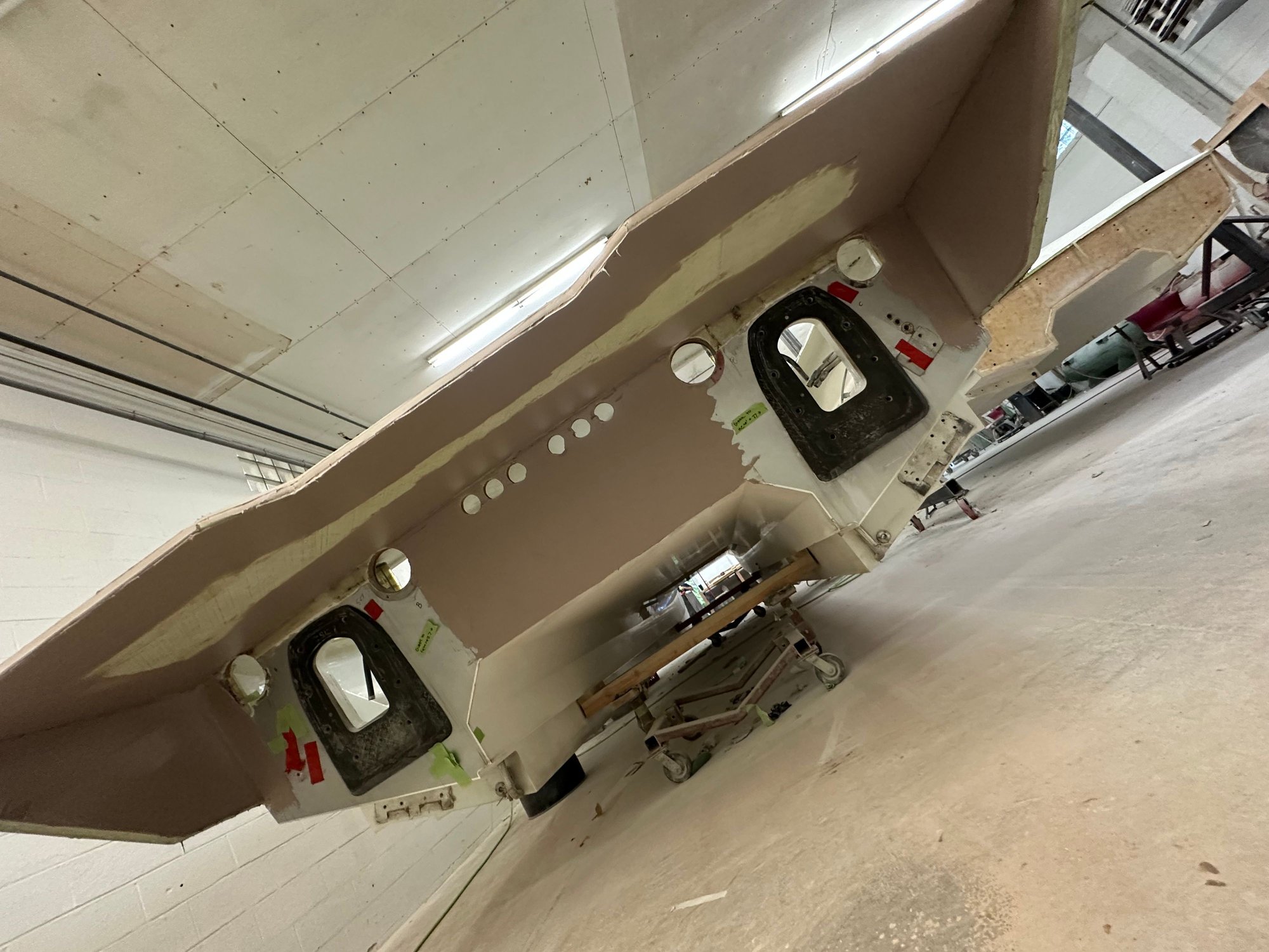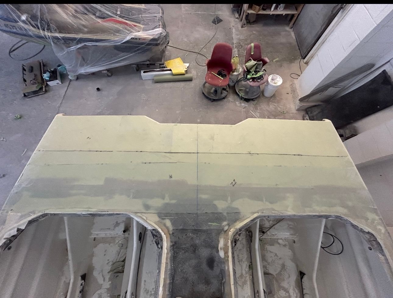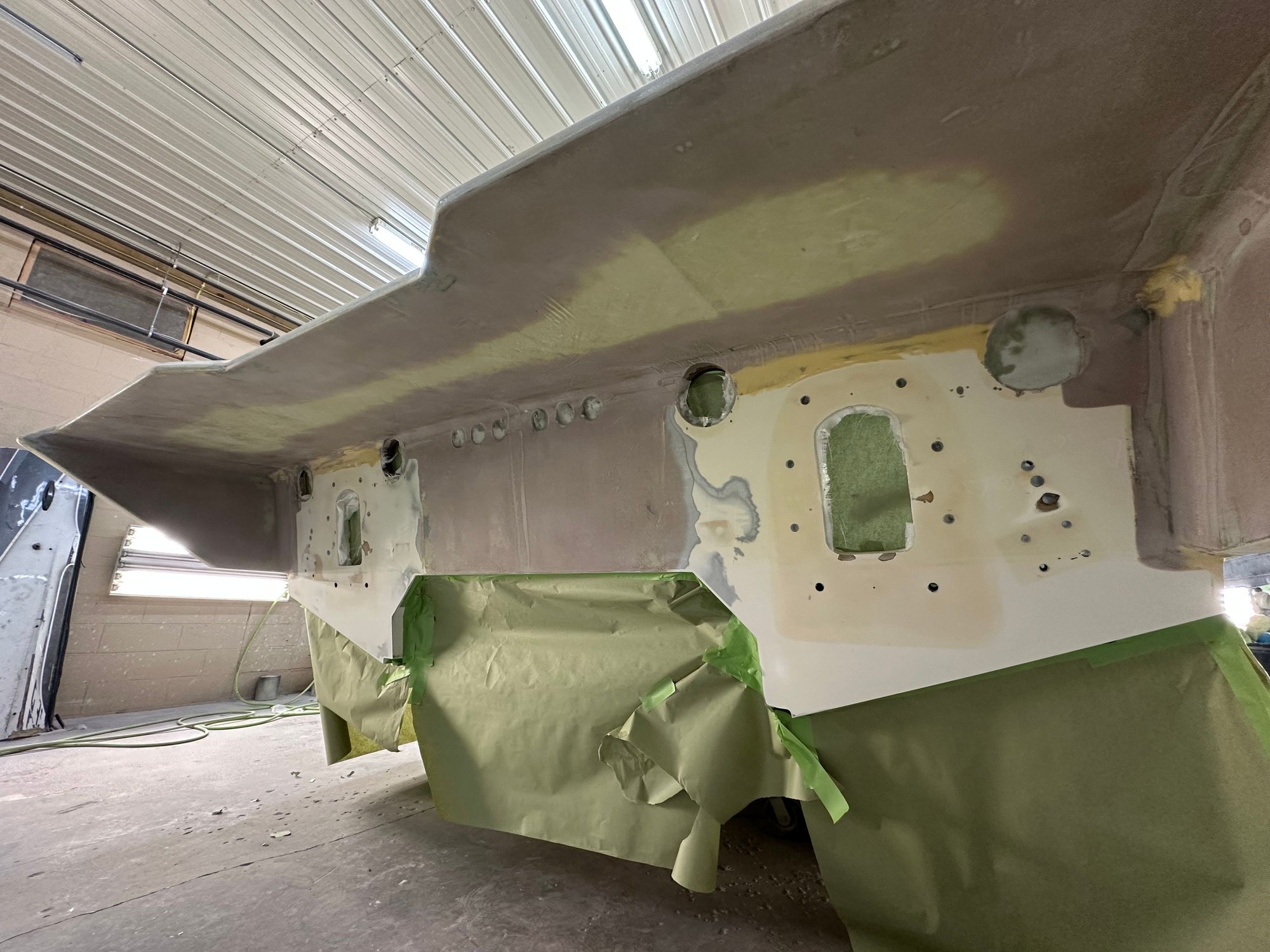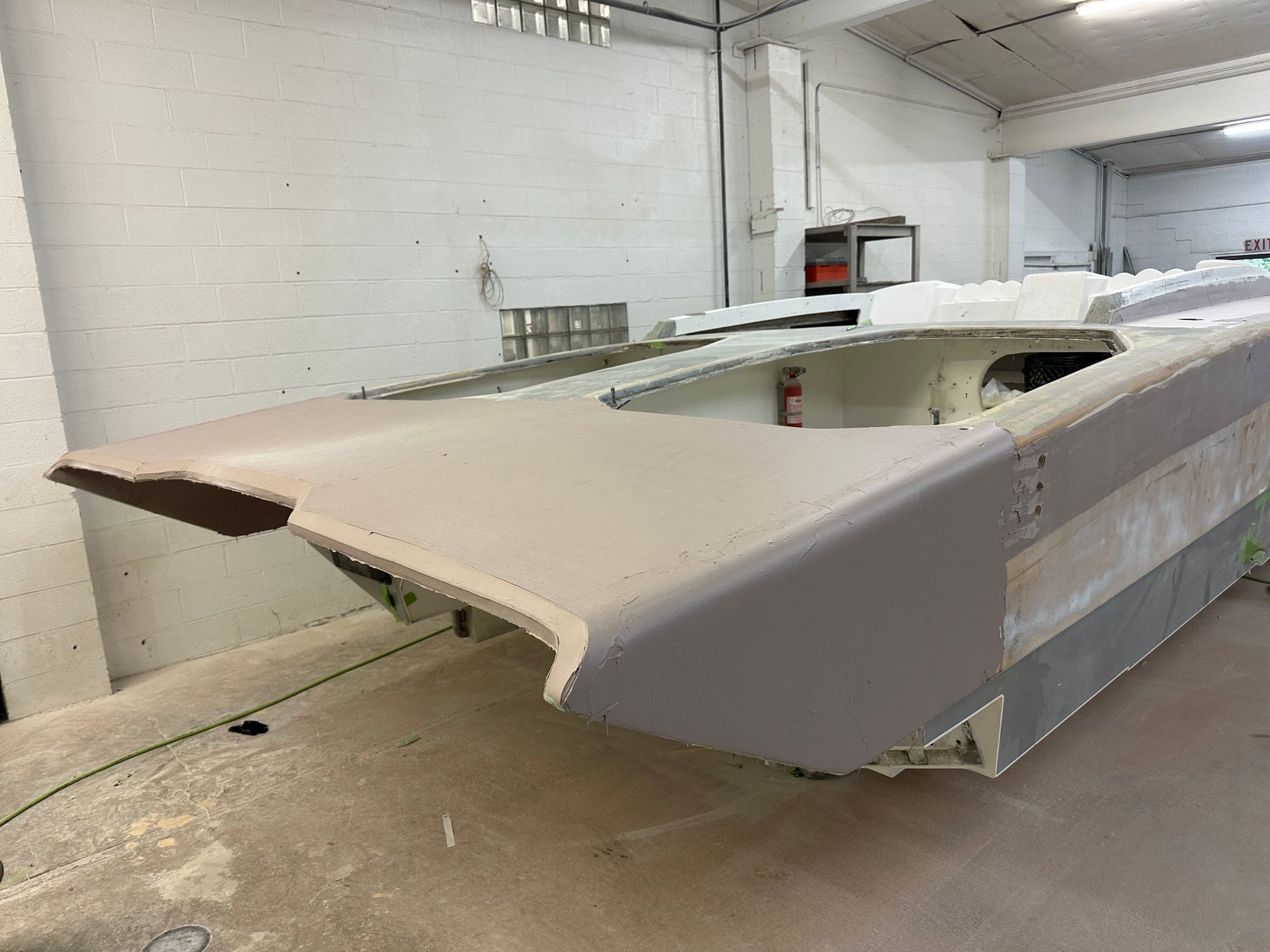 big update. She’s all the way in primer. Full bodywork on deck sides and bustle. Full new cheese Matt. And primer now. Going to get the sub floor in and keep it moving.