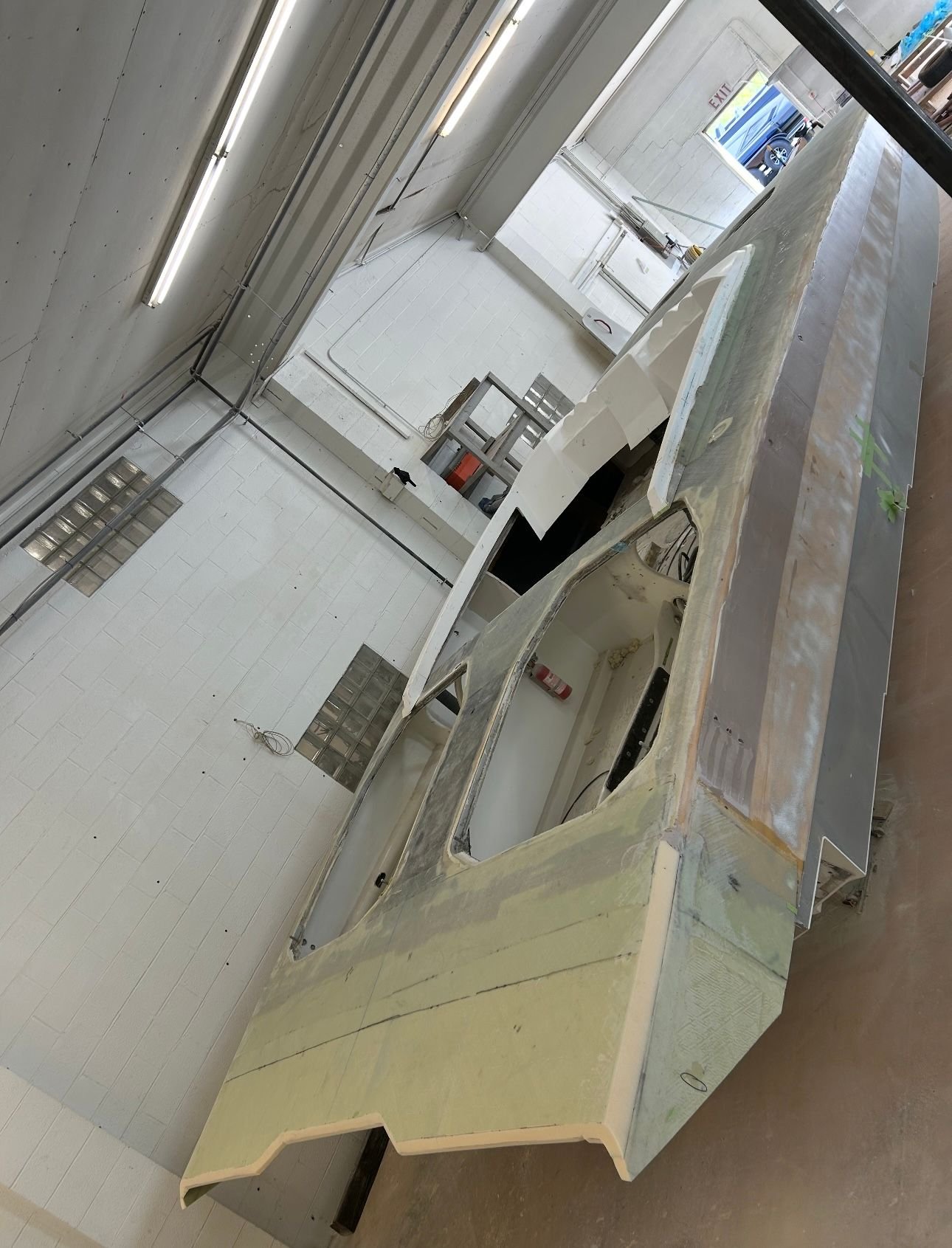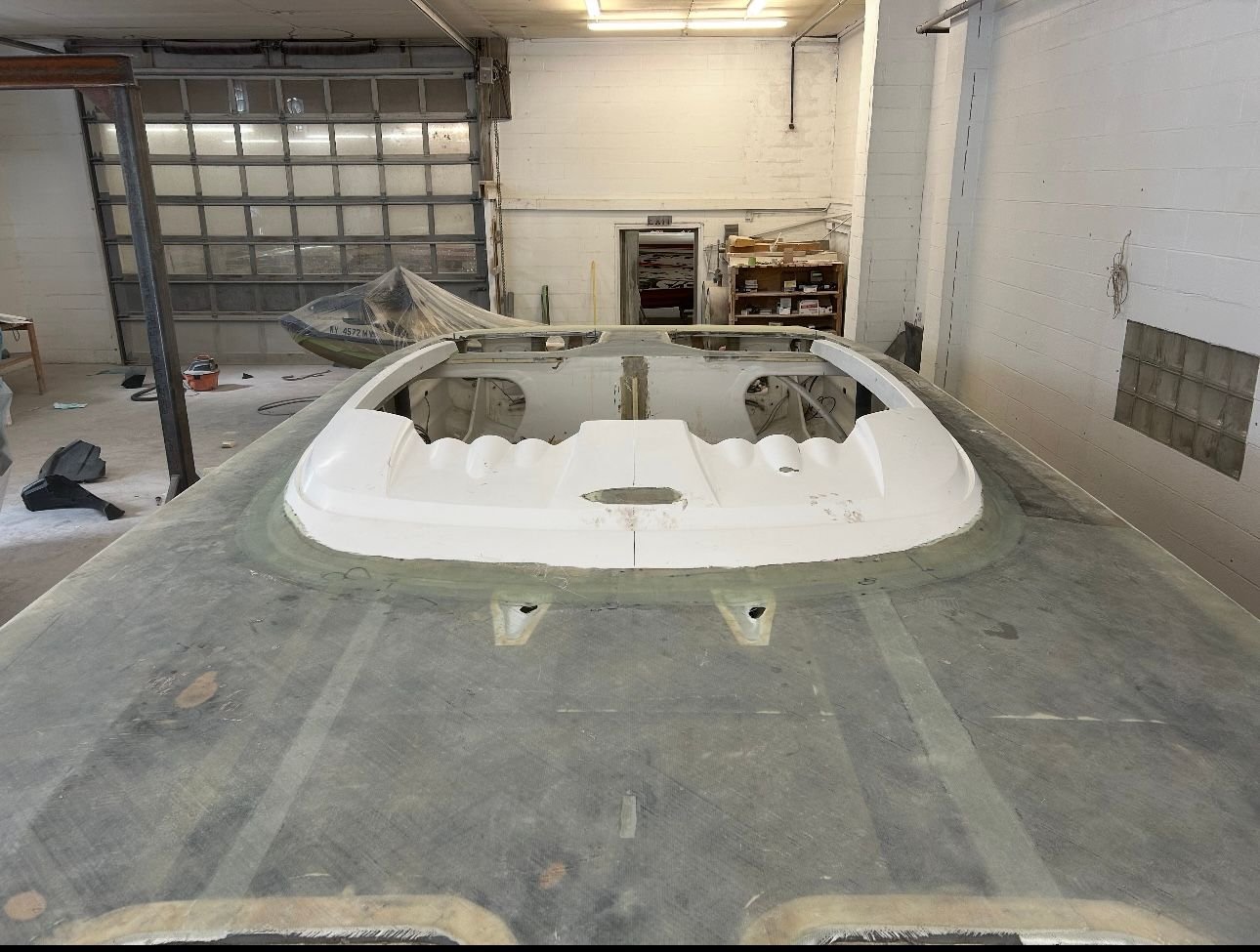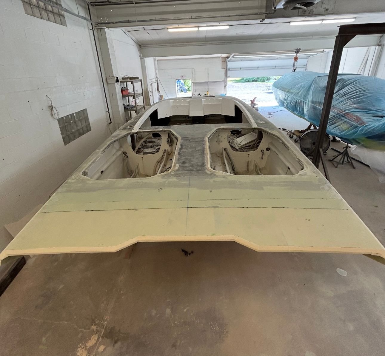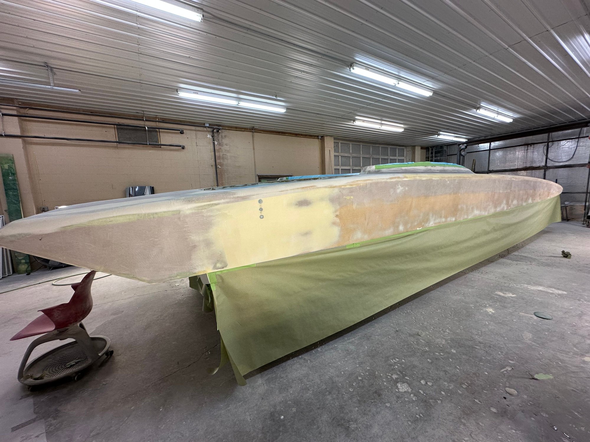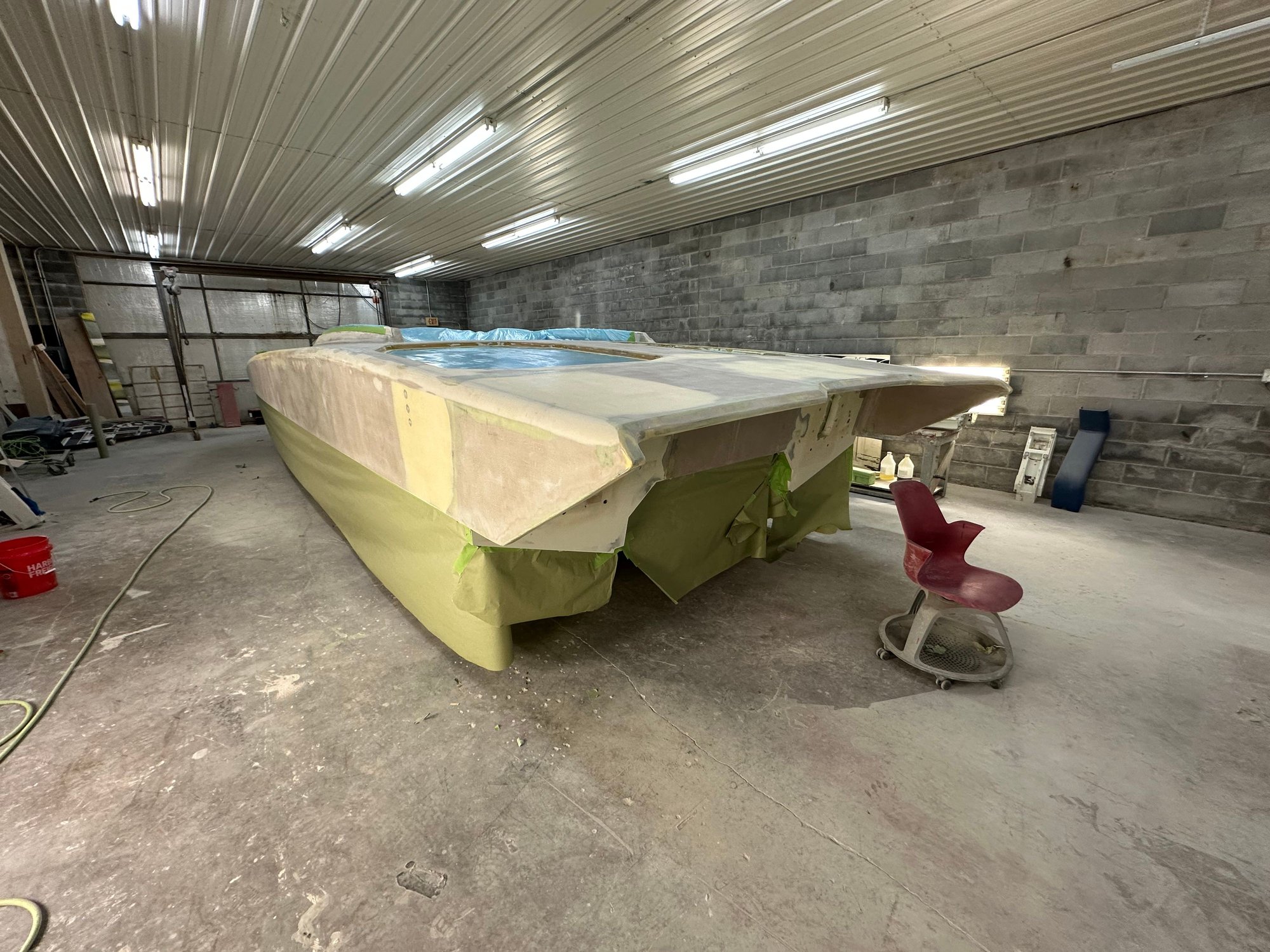 big update. She’s all the way in primer. Full bodywork on deck sides and bustle. Full new cheese Matt. And primer now. Going to get the sub floor in and keep it moving.