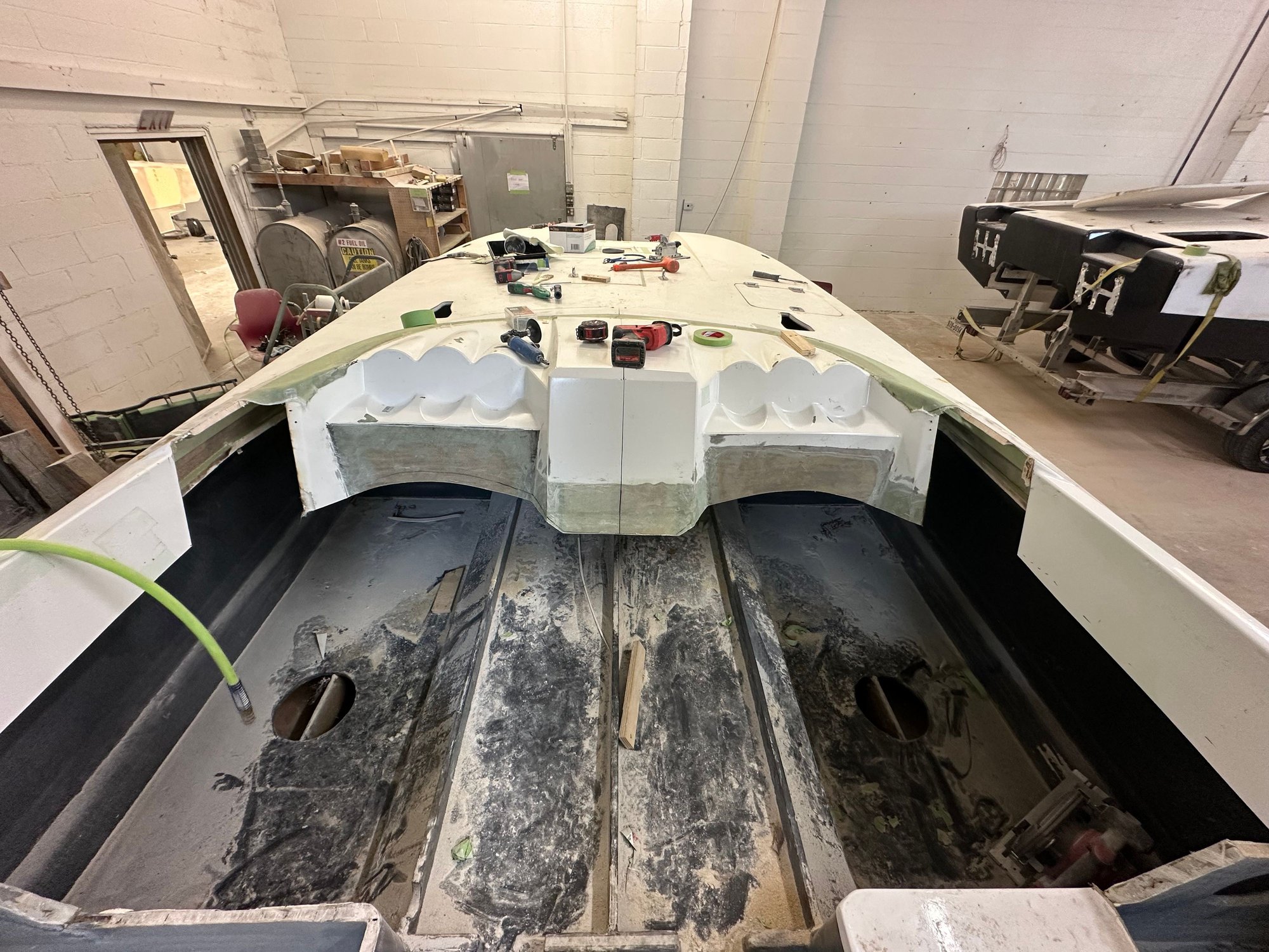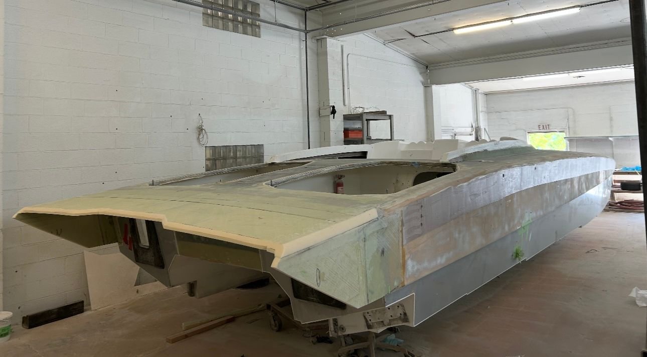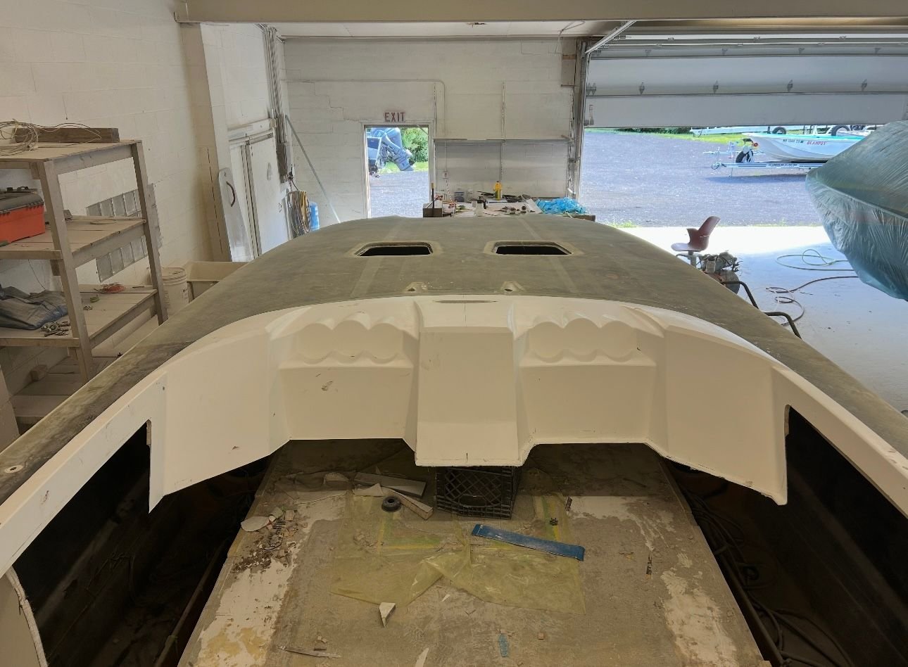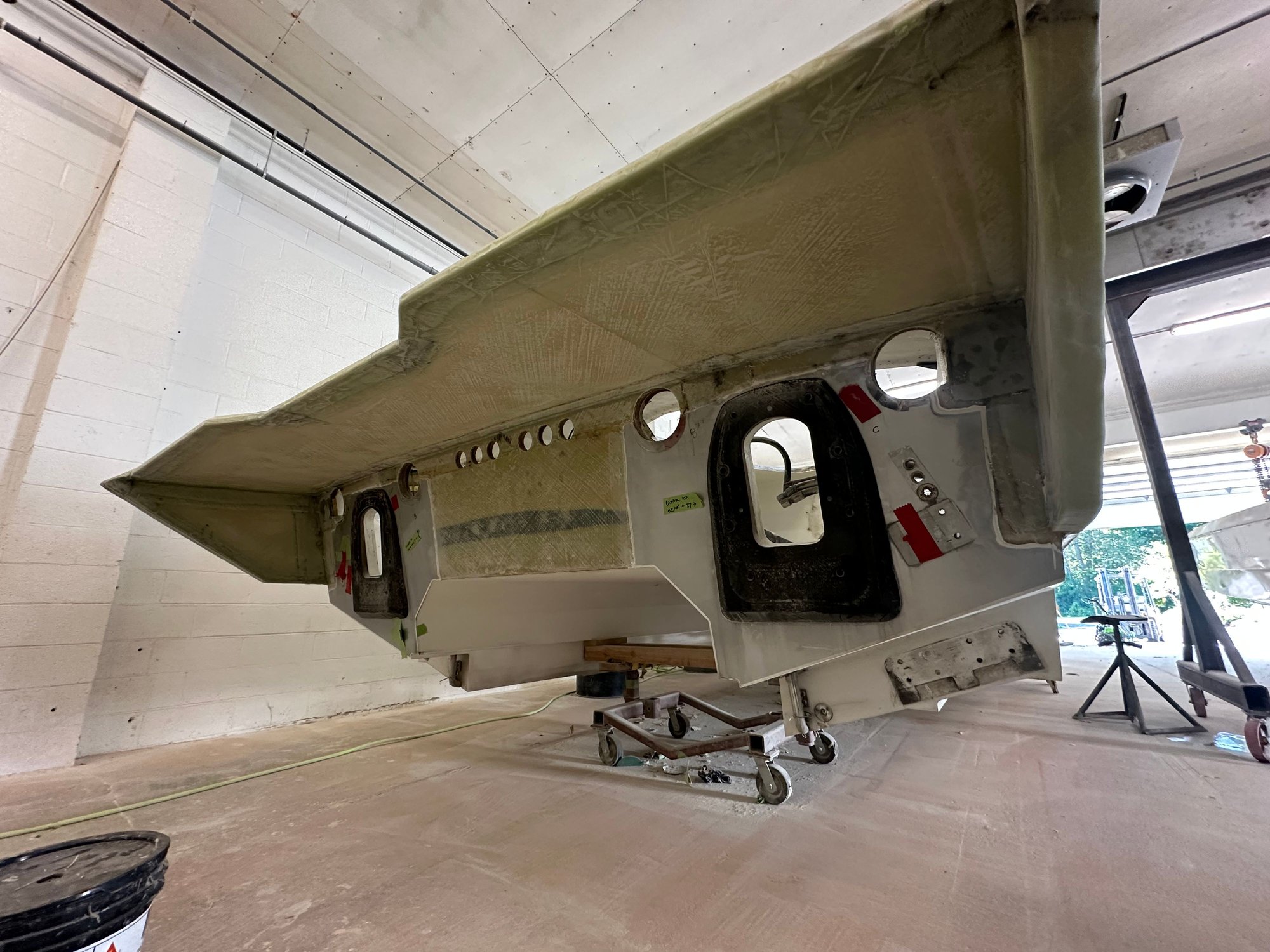 big update. She’s all the way in primer. Full bodywork on deck sides and bustle. Full new cheese Matt. And primer now. Going to get the sub floor in and keep it moving.