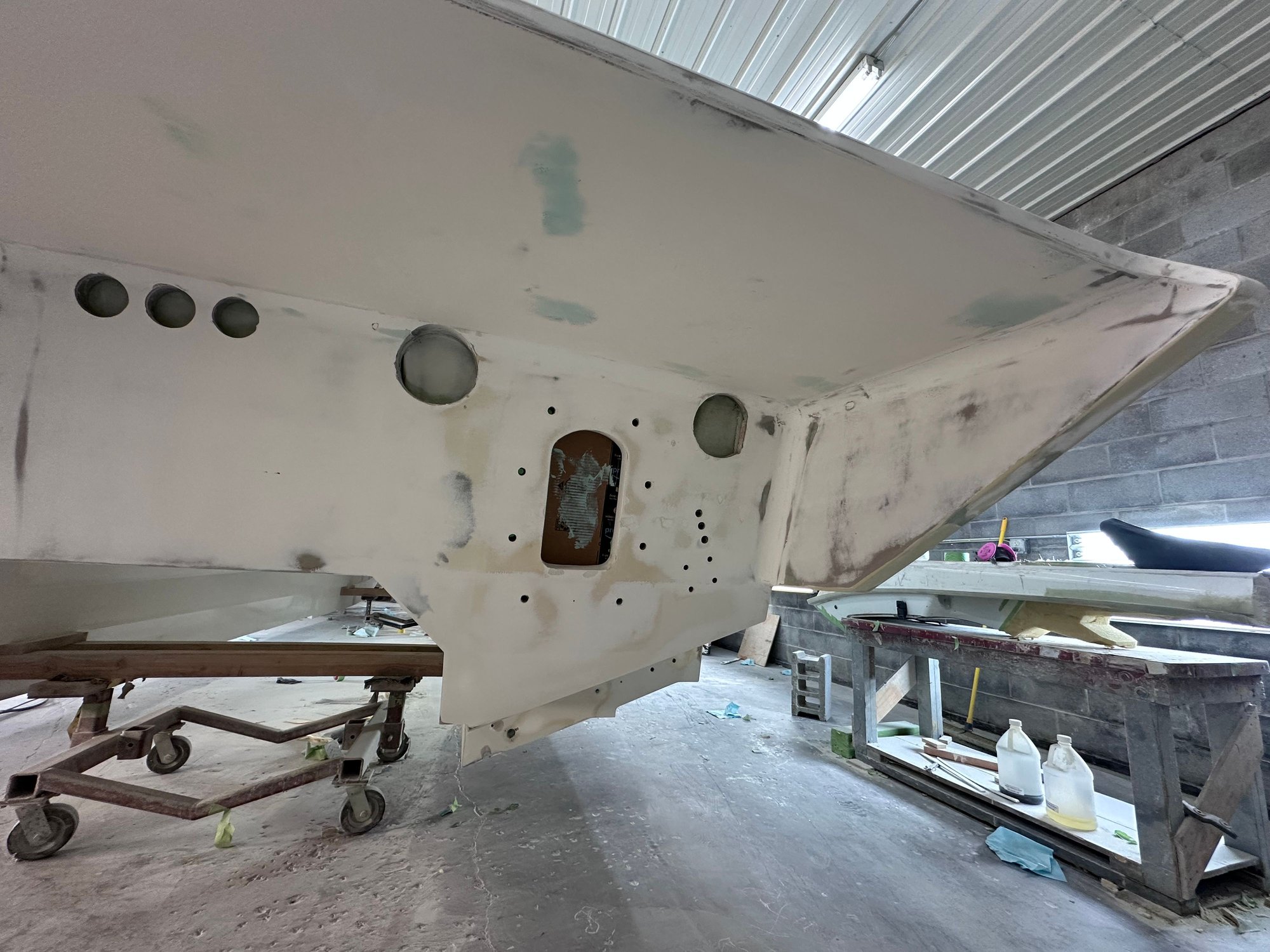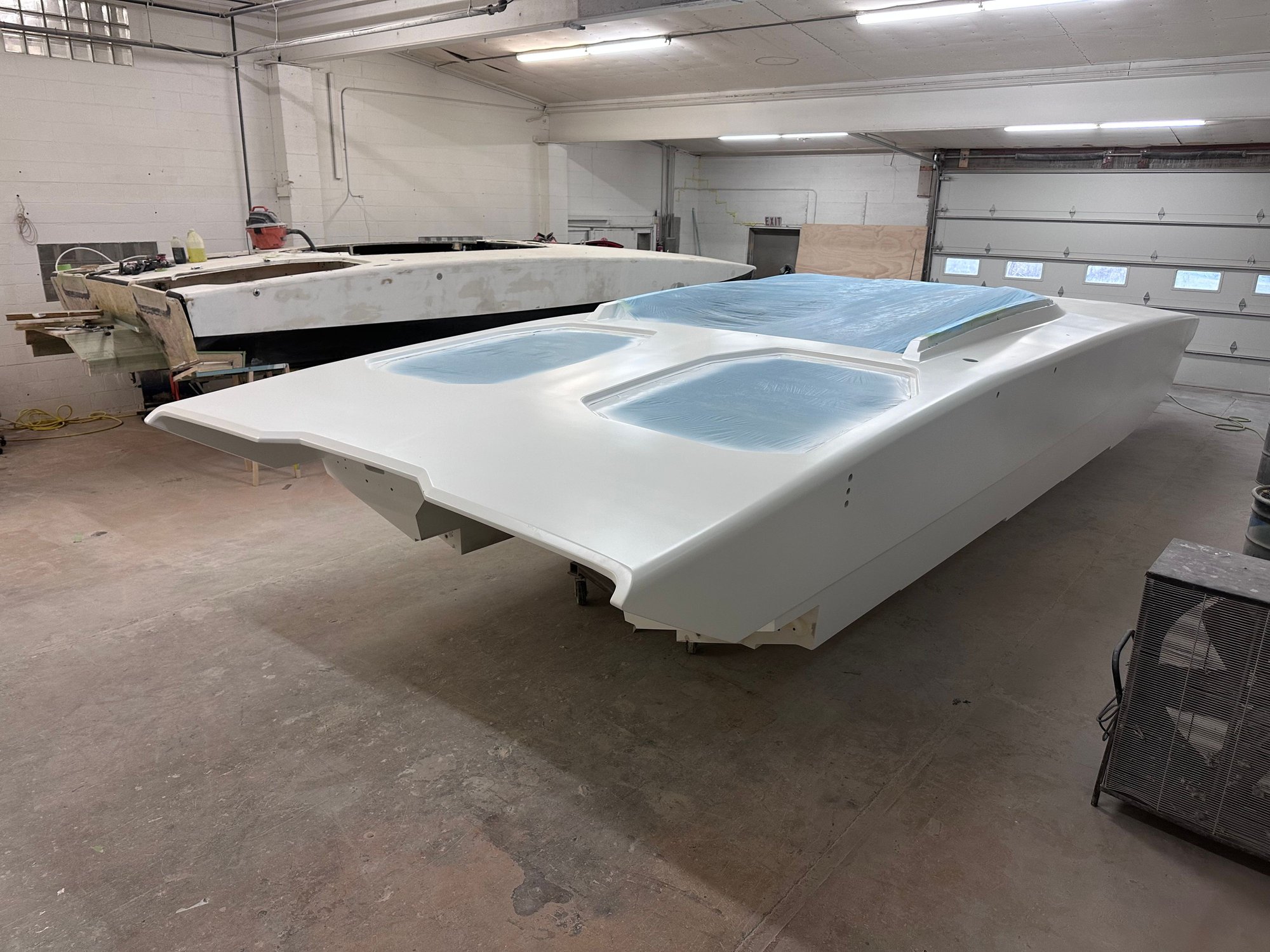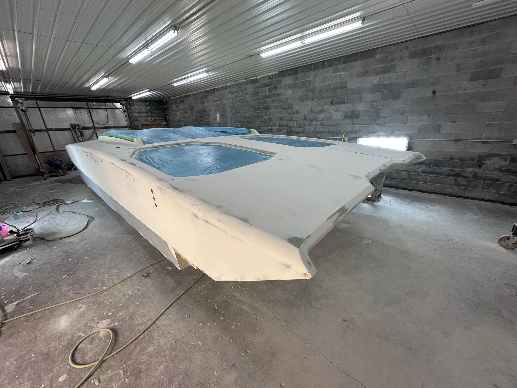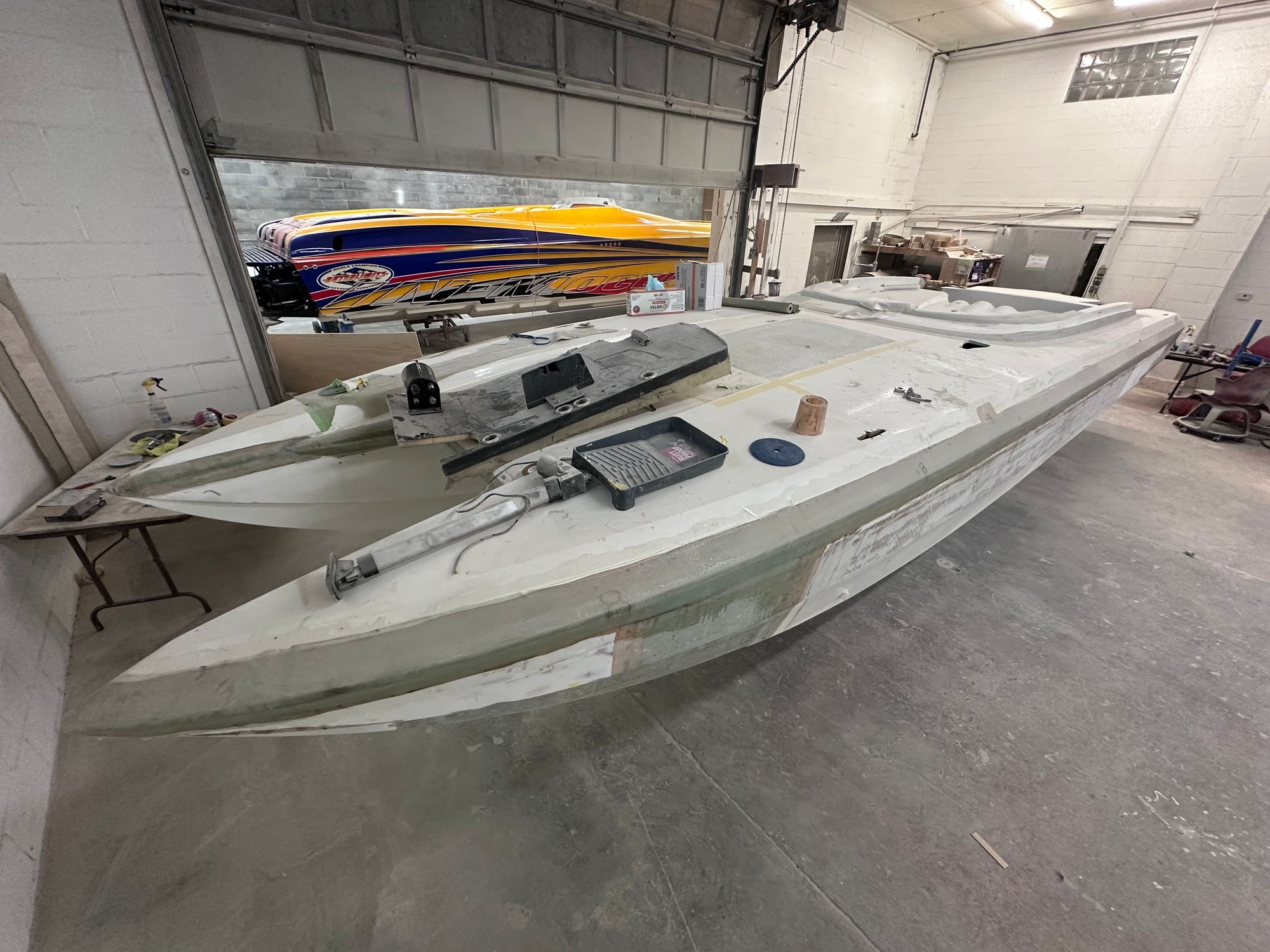 Fully capped , windshield conversion 28 skater in process after mass rot. Another x race boat with a past life. And a sweet 308 project rolling. Deleting the outboards, BBC and stern drive conversion. Tunnel extension getting roughed in and deleting the notch.