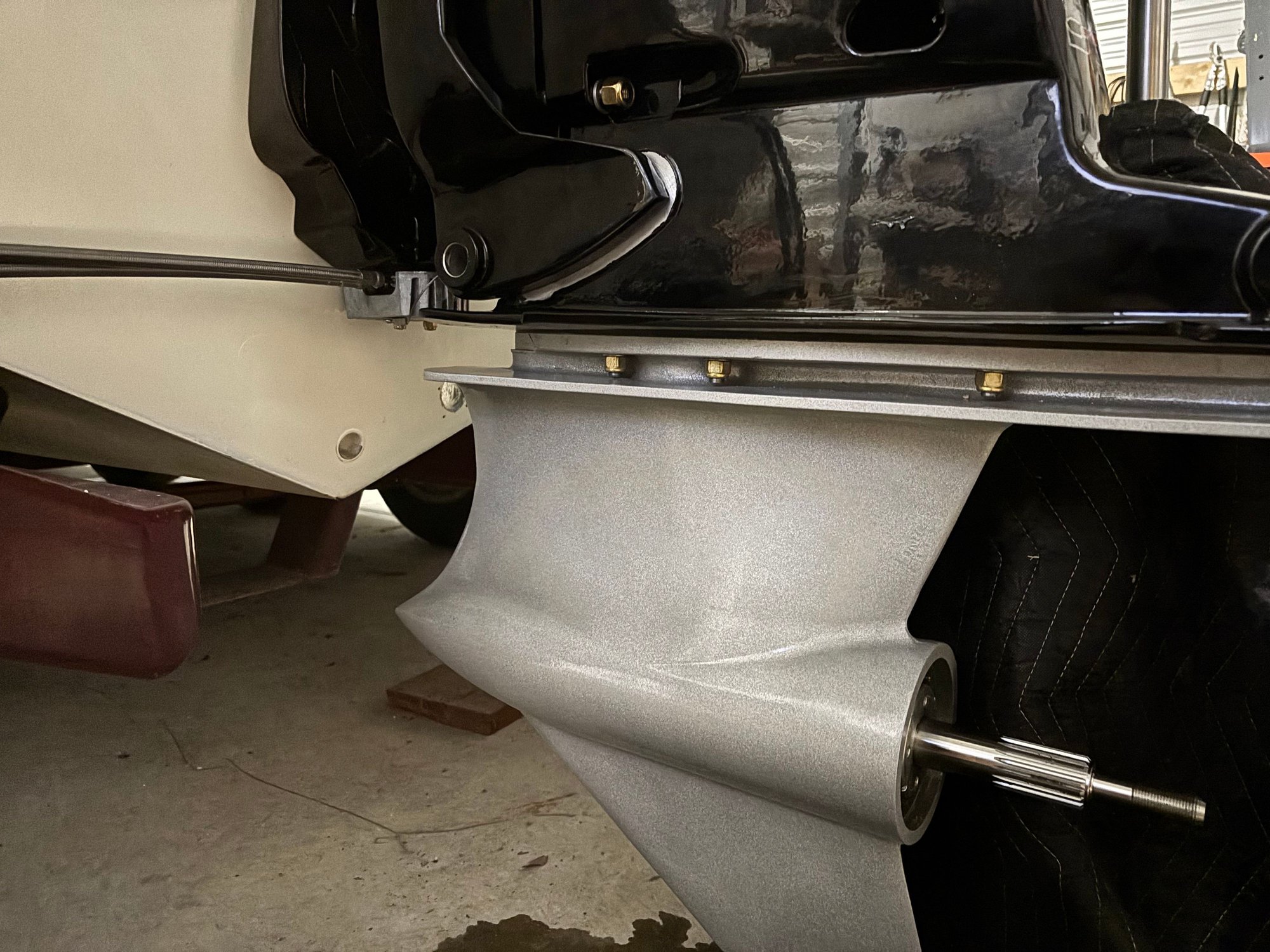The boat had an electric shift Merctrans 2 which the tail stock is leaking. A TRS drive with a nose cone. The drive seems good, but I am going to pressure test it. The transom assembly looks good and tight. I want to shoot new gelcoat on the transom while I’m at it. The boat had the cheesy bennet tabs.