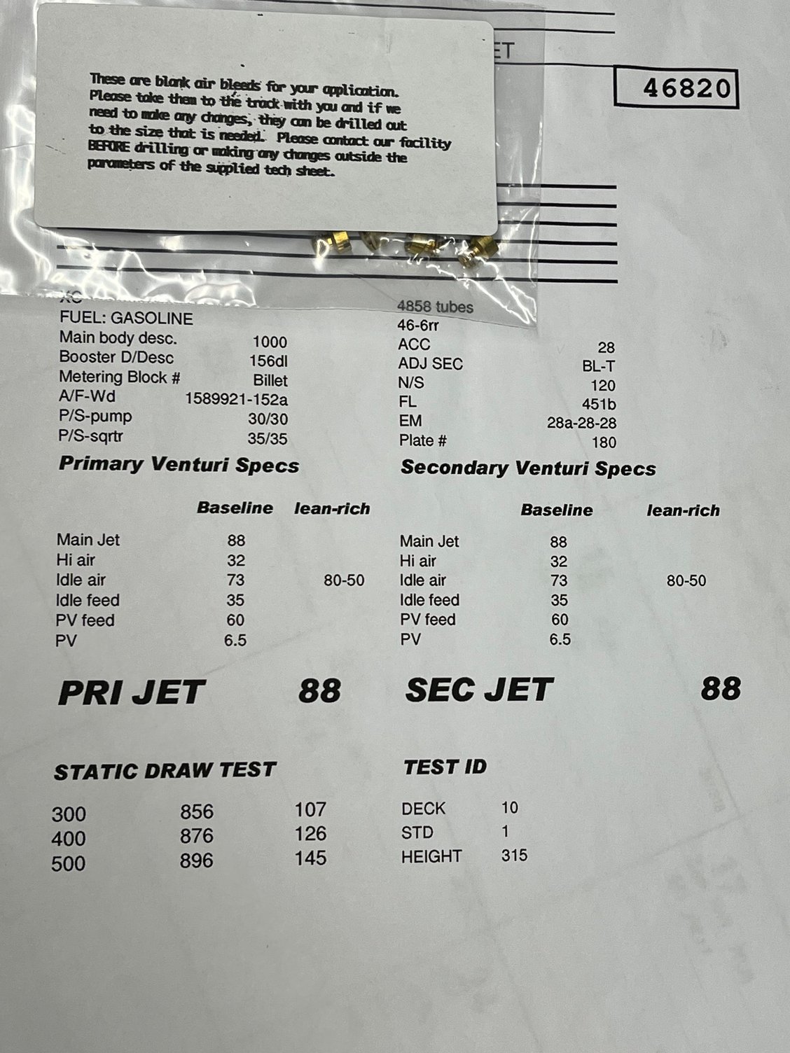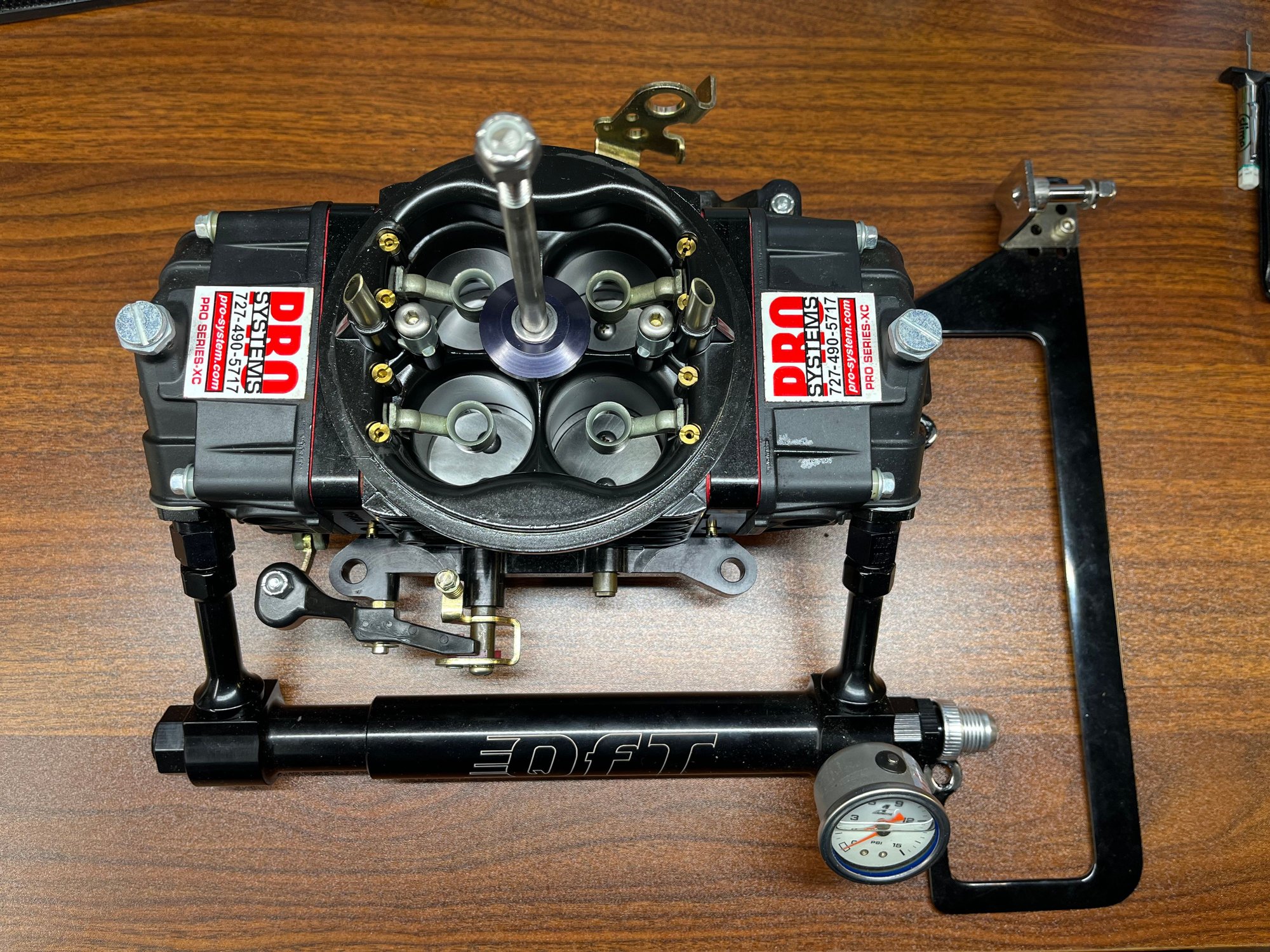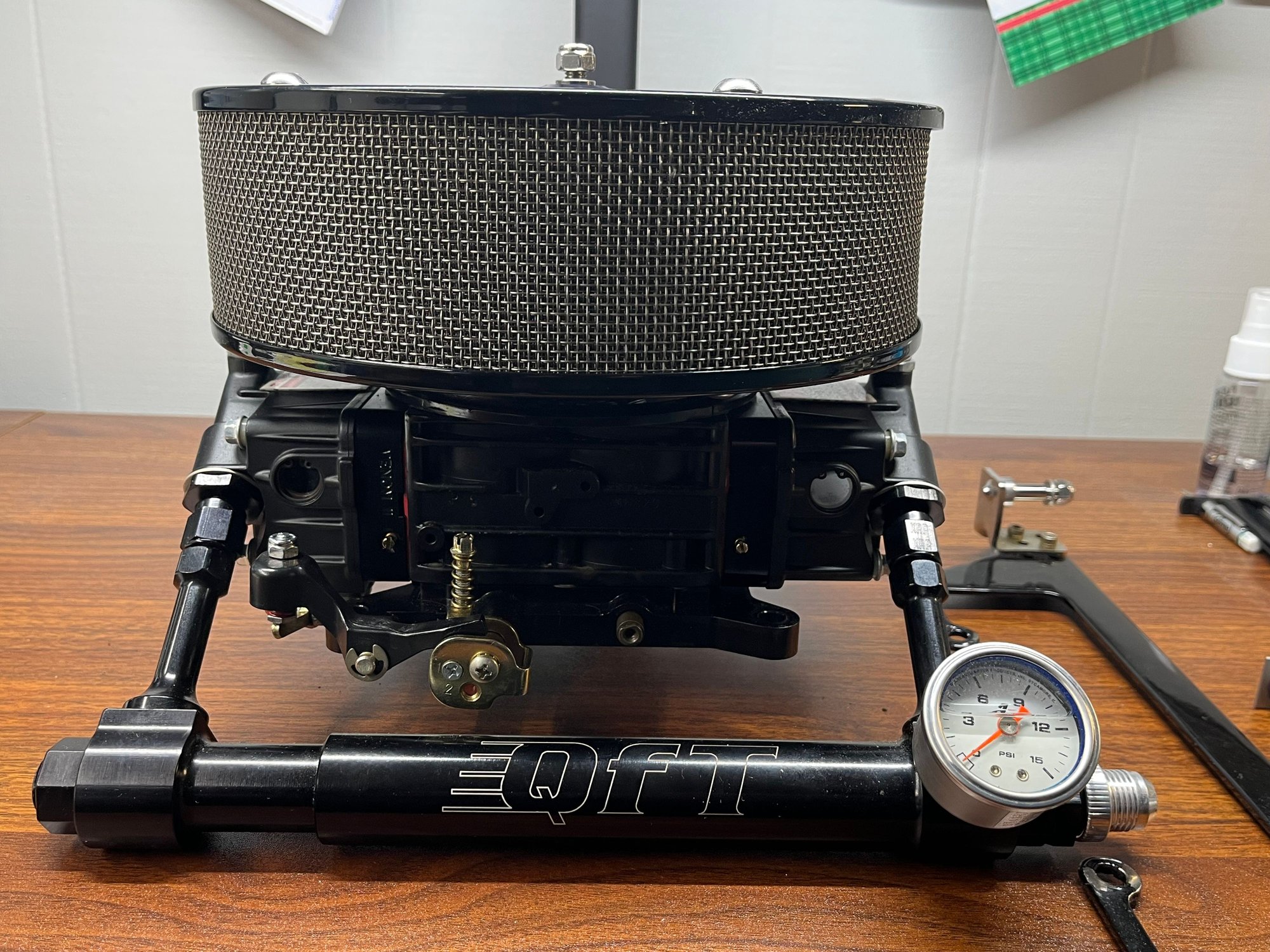 Carb includes QFT fuel log w/ Aeromotive gauge, 3" x 10" Gaffrig flame arrestor, and Hardin throttle bracket with cable adapter for Mercruiser.