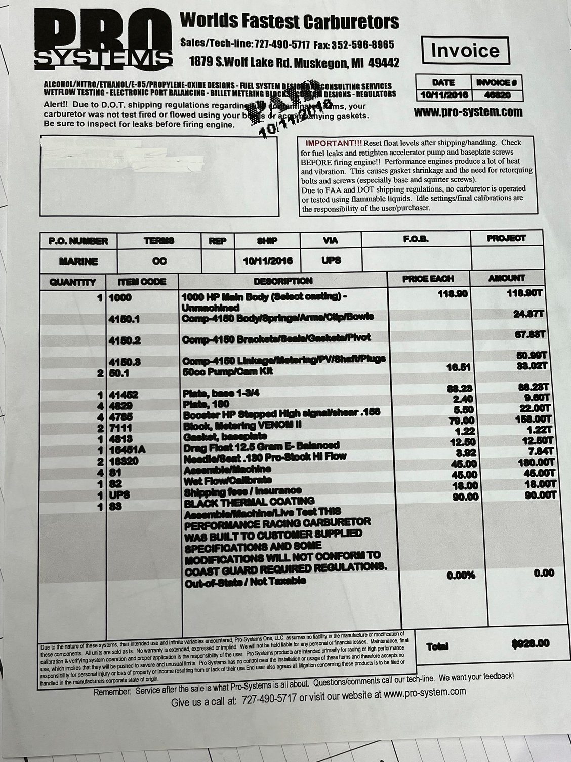 Pro Systems 1000 HP blower carb with approximately 15 freshwater hours of use on it. Carb was set up for 496 BBC with Blower Shop 250 w/ 7 PSI.