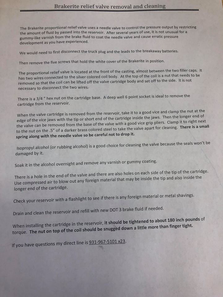 Here’s a tip for those that have a BrakeRite Titan electric over hydraulic actuator and it's not performing as well as it use to or as expected. In my case, my brand new actuator never built any pressure and I’ve messed with it for weeks trying to figure out what could be wrong with no luck. Eventually I found the phone number for Lon at Dexter and he was fantastic to work with. Since this unit had been setting for a year without being used he suspected the “test fluid” they use at the factory had collected moisture and possibly gummed up the valve. Though he acknowledged that it was still under warranty, he authorized me to pull it apart and clean the valve and sent me the attached instructions. As you can see by what was a clean white shop towel, the valve was filthy. I cleaned it in alcohol and reinstalled it and it works fantastic. It’s honestly a 15 minute project so easily done and might not be a bad idea if yours doesn’t seem to hit as hard.