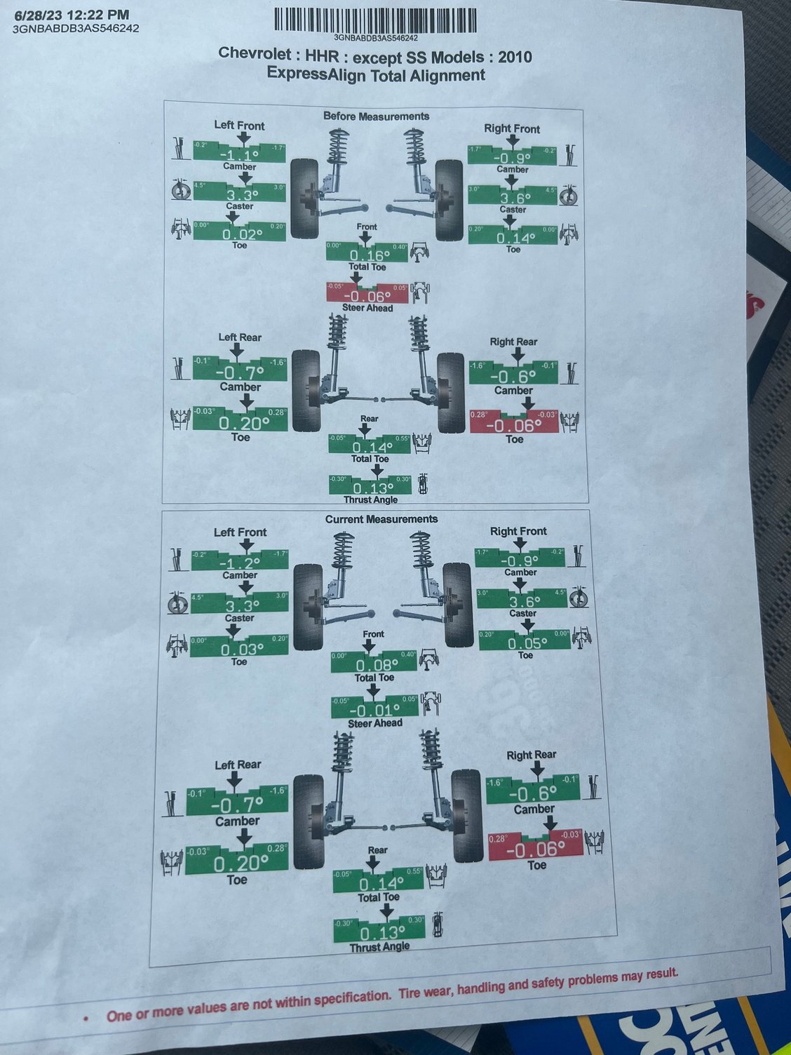 This was done at Dayton Tire today. They didn’t make any adjustments.l or charge me. I’ve been told about the rear being tied out, but another shop (Acme Spring) I was referred to indicates there is “no way” that .06 degrees is enough to make it pull like it does. I’ve got an appt with Acme tomorrow to let them have a look at it. He actually mentioned motor/transaxle mounts. Sounds odd, but they know more than me, so…
